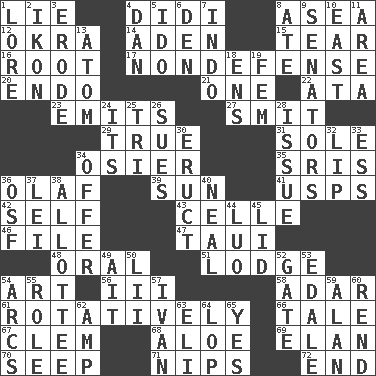 ACROSS 1. Whopper 4. "You Light Up My Life" star Conn 8. At sea 12. Gumbo ingredient 14. An important port of Yemen 15. Pull apart 16. Carrot, for example 17. Unrelated to defense, as in spending 20. Inside; within (prefix) 21. Single 22. "One Day ___ Time" 23. Sends forth 27. Stricken, poetically 29. Loyal 31. Flatfish 34. Flexible twig of a willow tree 35. Indian titles of respect 36. Norwegian king 39. Player for Phoenix 41. United States Postal Service (abbr.) 42. Itself 43. Cell (Danish) 46. Do some clerical work 47. "Change" in Tahitian 48. Of the mouth 51. Cabin 54. Tate display 56. One more than two 58. The sixth month of the Jewish calendar 61. Happening in regular succession 66. Falsehood 67. To starve (Brit.) 68. _ vera 69. Liveliness 70. Ooze 71. Cuts off 72. Conclusion DOWN 1. Old wives' tales, e.g. 2. Image 3. Wear away 4. One of the 12 tribes of Israel 5. Wedding promise 6. Lair 7. _ china 8. Had dinner 9. Elected representatives 10. Compass direction 11. Type of rug 13. Smallest unit of an element 18. Followers of ems 19. Opposite of masc. 24. It is 25. Three (prefix) 26. Institutes legal proceedings 28. Come out of 30. Spew [out] 32. Mouth edge 33. Curvy letter 34. Auction bid 36. Order of Saint Francis (abbr.) 37. Flowery wreath 38. One to whom something is allotted 40. Actress Patricia 44. Nilotic language 45. Flaplike covering 49. Small island 50. Cards in a Roman deck? 52. Yard entry 53. Peak District village in England 54. Curves 55. Hero or heavy, e.g. 57. _ the terrible 59. Actor Alda or Thicke 60. Tear apart 62. Electrical Unit 63. Biblical high priest 64. Chop off 65. Consenting reply