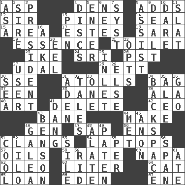 ACROSS 1. Viper 4. Cub Scout units 8. Does sums 12. Title for a knight 13. Abounding in pines 14. Lick closed 15. Type of rug 17. _____ Park, CO 18. "Two Mules for Sister ____" 19. Gist 21. Rest room 23. Mamie's mate 24. Indian title of respect (Mr.) 26. Pacific Standard Time (abbr.) 27. Freehold land 28. Remaining after all deductions 30. Compass dir. 31. Ringlike coral islands and reefs 34. Paper or plastic container 37. Car or cant ending 38. Natives or inhabitants of Denmark 39. In the manner of 40. Tate display 41. Keyboard key 42. Corporate head (abbr.) 43. Object of repulsion 44. Create 46. Commissioned military rank (abbr.) 47. Plant excrement 50. Followers of ems 51. Rings like a ship's bell 54. Portable computers 57. Petroleums 58. Feeling or showing extreme anger 60. California wine valley 62. Margarine 63. 61 cubic inches 64. Feline 65. Grant temporary use of 66. Paradise 67. Compass dir. DOWN 1. White ___ sheet 2. Beget 3. Elected leader of a country 4. Plates 5. Keyboard key 6. Born 7. System (abbr.) 8. Help 9. Started a card game 10. Have the gumption 11. Narrow board 13. Writing instrument 16. "____ silly question..." 20. Snakelike fish 22. Elects 25. An arm off of a larger body of water 27. One who uses or employs something 29. Otherwise 30. Ocean 31. Arabian gulf 32. Falsehoods 33. Single 34. Keyboard key 35. Toward shelter 36. E Mali city 41. Mild oath, euphamism for damn 43. Gillaume's butler role 44. Was introduced to 45. Soon (poet.) 46. An organ shaped like a helmet 48. Having winglike extensions 49. Eucharist need 51. Calm and collected 52. _ and Stitch 53. Filth; sediment 55. For each 56. Connect, as a bridge 59. To free from 61. Had dinner