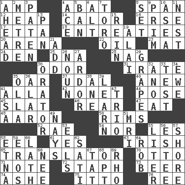 ACROSS 1. Electrical Unit 4. Blind as ____ 8. Connect, as a bridge 12. Pile 14. Bodily heat indicating an inflammation 16. Celtic language 17. Singer James 18. Pleas 20. Sports stadium 22. Petroleum 23. Floor covering 24. Lair 25. Heredity factor (abbr.) 28. Tired old horse 30. Aroma 31. Feeling or showing extreme anger 35. Rowing implement 37. Freehold land 40. Afresh 41. Silent film actress Nazimova 42. Music written for nine 44. Airs 45. Narrow board 46. Buttocks 47. Erode 48. Composer Copland 50. Basketball hoops 52. Actress Charlotte 54. And not 55. French article 58. Snakelike fish 61. It is so 63. From or relating to Ireland 65. Interpreter 70. Von Bismarck 71. Brief written record 72. Staphylococcus 73. Fermented drink made from hops 74. American tennis player Robert 75. "Tell ____ the Marines!" 76. To separate or throw off DOWN 1. Having the leading position 2. Distance measurement (Brit.) 3. Eucharist need 4. Adept person 5. Prohibit 6. The first octave above the treble staff 7. "Corrida" creature 8. Put into a specified state 9. Demure 10. At sea 11. A home for chicks 13. Baking dish 15. It's straight from the horse's mouth 19. Jai _ 21. Increase 26. Part of speech 27. Zeal 29. Wine fruits 30. Speaker 32. Small Philippine buffalo 33. Trial 34. She-sheep 35. Spanish pot 36. Having or resembling wings 38. A saturated hydrocarbon 39. Memorize 41. White ___ sheet 43. Musical group of three 49. Negative votes 51. Medical imaging device (abbr.) 53. Snakelike fish 55. 61 cubic inches 56. First name in cosmetics 57. Dinah or Pauly 58. Inactive volcano in Sicily 59. Greek god of love 60. Thin strip of wood or metal 62. Suttee (variant) 64. Director Reiner 66. Born 67. Make lace 68. Elect 69. 17th letter of the Greek alphabet