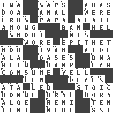 ACROSS 1. _ tizzy (2 wds.) 4. Plant excrements 8. Ancient river in northeast Turkey 12. ___ good deed 13. Of or related to the anus 14. We are 15. Blunders 17. Dad 18. Having winglike extensions 19. Amid 21. Prohibit 23. Cartoonist voice _ Blanc 24. Snob 26. Mountains (abbr.) 28. Had on 30. Curse 34. Or not 37. _ the terrible 39. Assistant 40. Insect wing 41. Fertile tracts in a desert 43. Heredity factor (abbr.) 44. It's straight from the horse's mouth 46. Moist 47. Hearing organ 48. Eat 51. Shout 54. Opposite of masc. 55. Allots cards 58. "One Day ___ Time" 61. Directed 63. Unemotional 65. Child's nurse 67. Relating to the mouth 71. Israeli folk dance 72. Medicinal plant 73. Painter Guido (1575-1642) 74. "___ Little Indians" 75. Portable shelter 76. Ancient Persian 77. Fast jet (abbr.) DOWN 1. The main thing one is thinking about 2. Typical standards 3. Composer Copland 4. Plant excrement 5. Santa ___, CA 6. Infant food 7. Thick slice 8. Leather borer 9. 480, 500 or 516 sheets of paper 10. Johnson of "Laugh-In" 11. Sew up the eyelids of hawks and falcons 16. Overwhelm 18. Opposed to 20. Thick or sticky substance 22. Electrical Unit 25. Musical group of three 27. R.R. building 29. Elude 30. Foe 31. Flintstone garb 32. Pulitzer Prize-winning author Ferber 33. Separate forcefully 34. Drug cop 35. Margarine 36. Water falling in drops from the sky 38. White ___ sheet 42. Broke a traffic law 45. Science/research agcy. 49. Ubangi River tributary 50. Madame (abbr.) 52. French article 53. Thin strip of wood or metal 56. Plunders 57. Fathers 58. Blind as ____ 59. Lacquered or enameled metalware 60. Soon (poet.) 62. Dormintory (informal) 64. Patter 66. Fish or hair follower 68. To separate or throw off 69. Plus 70. Whopper
