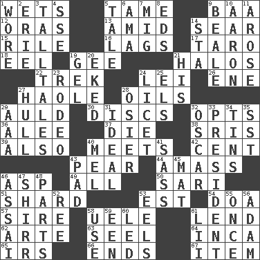 ACROSS 1. Moistens 5. Not wild 9. Sound made by sheep 12. Mouths or openings 13. Among 14. Shrivel 15. Cause heat under the collar 16. Fails to keep up a pace 17. Pacific island yam 18. Snakelike fish 19. Turn to the right 21. Radiant circles of light 22. Long journey 24. Flowery wreath 26. Compass dir. 27. White Person, in Hawaii 28. Lubricates 29. Old (Scot.) 30. Flat circles 32. Elects 36. Toward shelter 37. Expire 38. Indian titles of respect 39. In addition 40. Confronts 42. Penny 43. Lightbulb-shaped fruit 44. Collect or gather 46. Viper 49. Everything 50. Indian skirt 51. Pottery fragment 53. Eastern Standard Time (abbr.) 54. ___ good deed 57. The founder of a family 58. Ubangi River tributary 61. Grant temporary use of 62. Johnson of "Laugh-In" 63. Stitch closed the eyes of (a falcon) 64. South American Indian 65. Big collection agency 66. Extremities 67. A distinct part DOWN 1. Had on 2. One of the Great Lakes 3. Baron Munchausen's specialties 4. Compass dir. 5. Story 6. Wet nurse (var.) 7. Russian fighter aircraft 8. Begley and Asner 9. Memphis, Tenn. Street 10. Composer Copland 11. Came up 14. R.R. building 19. Set 20. Supplemented with great effort 21. Part of HMS, perhaps 23. Cowboy competition 24. It is permitted: Lat. 25. Raised railways 27. Frame or body of a ship 28. Flexible twig of a willow tree 29. Auto club (abbr.) 31. Perfect 32. Witty Wilde 33. Elected leader of a country 34. Airtight sealed metal containers 35. Fast jet (abbr.) 40. Cartoonist voice _ Blanc 41. Backtalk 43. Writing tablet 45. Floor covering 46. Slender Brazilian palm 47. Bake eggs in their shells 48. Actors' quests 52. To separate or throw off 53. Snakelike fish 55. At one time in the past 56. First of billions? 58. Purpose 59. Car or cant ending 60. Directed 61. Cards in a Roman deck?