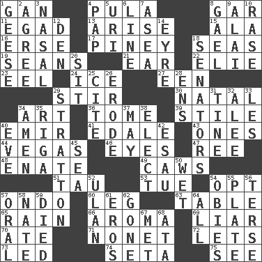 ACROSS 1. Separate the seeds from cotton 4. Monetary unit of Botswana 8. Slender fish 11. Mild oath 13. Get up 15. Insect wing 16. Celtic language 17. Abounding in pines 18. Oceans 19. Actors Connery and Penn 21. Hearing organ 22. Writer Wiesel 23. Snakelike fish 24. Frozen water 27. Car or cant ending 29. Agitate 30. Brizilian seaport 34. Nonscientific branch of learning 36. Heavy book 39. Vertical member of a panel or frame 40. Arab leader 41. Peak District village in England 43. Singles 44. Viva Las _ 46. Snake ____ (dice throw) 47. To sift 48. Related on the mother's side 49. Crow sounds 51. The 19th letter of the Greek alphabet 53. Third day of the wk. 54. Choose 57. Southwest Nigerian state 60. Part of a journey 63. Eating place 65. Water falling in drops from the sky 66. Scent 69. One who doesn't tell the truth 70. Had dinner 71. Music written for nine 72. Allows 73. Directed 74. Bristle 75. Observe DOWN 1. Honkers 2. Match 3. Relating to the nose 4. Infant food 5. RI univ. 6. Actor's bit 7. Toward the sea 8. Highlander 9. Jai _ 10. Raze (variant) 12. Lair 14. Jane of fiction 18. Legislators 20. Be seated 25. Quote 26. Eat (away) 28. Followers of ems 29. Ski resort town in Vermont 31. Prong on a fork 32. Toward shelter 33. French article 34. So be it 35. Capital of Latvia 37. Fifth month 38. Choose 40. First lady 42. He sold his birthright 45. Ocean 50. Dripping 52. ____ Bator 54. Off-Broadway awards 55. Food holder 56. Laconic 57. Of the mouth 58. Nathan's nickname 59. Passed on 61. Greek god of love 62. Went 64. Everything 67. Was introduced to 68. "One Day ___ Time"
