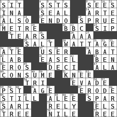 ACROSS 1. Be seated 4. Fast planes 8. Observes 12. _ tizzy (2 wds.) 13. Lick closed 14. Johnson of "Laugh-In" 15. In addition 17. Inside; within (prefix) 18. Disorder 19. Distance measurement (Brit.) 21. English channel? 23. Small drink 24. Rends 26. Auto club (abbr.) 28. Table seasoning 30. Electrical Measurement 34. Had dinner 37. One who uses or employs something 39. Blind as ____ 40. Experiment locale 41. Artist's stand 43. Benjamin's nick name 44. Greek god of love 46. Tenth: prefix 47. According to 48. Ingest 51. Leg joint 54. Three (prefix) 55. Elude 58. Pacific Standard Time (abbr.) 61. Mature 63. Wear away 65. Free of sound 67. Toward shelter 71. Coast Guard woman 72. Indian skirt 73. Depend 74. Raised railways 75. Woody plant 76. The longest river in the world 77. To riddle DOWN 1. Thailand, formerly 2. An arm off of a larger body of water 3. Clothes sense 4. Compass dir. 5. Elected rep. 6. Small amount or degree 7. Messy guy 8. Plant excrement 9. Blunders 10. Needle case 11. Ooze 16. Mouths or openings 18. Get outta here! 20. Epoch 22. Sound made by sheep 25. Turn sharply 27. _ moment's notice (2 wds.) 29. Sadhe (variant) 30. Raze 31. Swedish rock group 32. Highlander 33. Inactive volcano in Sicily 34. Actor Baldwin 35. Pacific island yam 36. Inky black, to poets 38. Compass dir. 42. Actor's bit 45. Fast jet (abbr.) 49. Mountain range 50. Russian fighter aircraft 52. Night before a holiday 53. Hearing organs 56. Drug addict 57. Peak District village in England 58. Inconspicuous attention getter 59. Play the lead 60. Hoop that covers a wheel 62. Merit 64. Celtic language 66. Falsehood 68. Luau accessory 69. Pipe bend 70. Sight organ