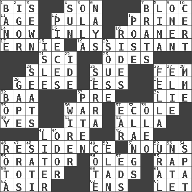 ACROSS 1. Again 4. Male child 7. Alliance 11. Mature 12. Monetary unit of Botswana 13. A-one 14. At this time 15. Inwardly 16. Wanderer 17. Bert's buddy 19. Helper 21. _-fi 23. Lyric poems 24. Downhill vehicle 25. Take to court 26. Opposite of masc. 29. Honkers 30. Double-curved letter 31. Shade tree 32. Sound made by sheep 33. Before (prefix) 34. Untruth 35. Elect 36. Armed conflict 37. Learning spot: Fr. 40. It is so 41. Call ___ day 42. Silent film actress Nazimova 43. Old wives' tales, e.g. 45. Actress Charlotte 46. Dwelling 51. Parts of speech 55. Speaker 56. Cassini of fashion 58. Reproach for some lapse or misdeed 59. Carrier 60. Small boys 61. "One Day ___ Time" 62. SW Saudi Arabia district 63. Followers of ems 64. Allow DOWN 1. Object of repulsion 2. Russian composer Stravinsky 3. Stitched 4. Player for Phoenix 5. Spanish pot 6. Negative votes 7. Naughty children 8. Pale green bean 9. Sign of things to come 10. Foregone conclusion 12. Parts 13. Airs 16. Amusement-park features 18. Small island 20. Lush 22. Binary compound 24. Theater features 25. Spanish missionary in California 26. Chap (slang) 27. Writer Wiesel 28. Madame (abbr.) 29. Stare wonderingly 32. Male child 33. Eucharist need 36. One who wires 37. Hearing organ 38. Rigngs loudly 39. Butter sub 43. 61 cubic inches 44. Scent 46. Roll call or roster of names 47. Greek god of love 48. Suttee (variant) 49. ____ d'Azur (French Riviera) 50. Style 52. Mountain range 53. Nathan's nickname 54. Argument over a trivial matter 57. Begley and Asner