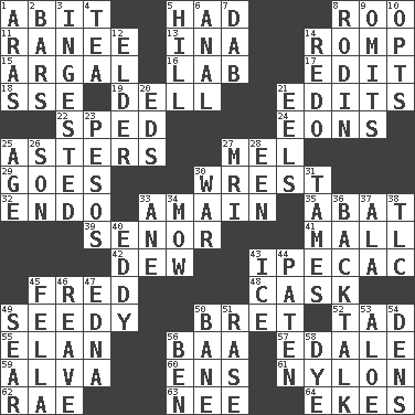 ACROSS 1. "This won't hurt ____!" 5. Possessed 8. Friend of Pooh 11. The wife of a rajah (variant) 13. _ tizzy (2 wds.) 14. Frolic 15. Therefore, facetiously 16. Experiment locale 17. Prepare for publication 18. Compass dir. 19. Small valley 21. Prepares for publication 22. Hurried 24. Immeasurably long periods of time 25. Michaelmas daisies 27. Cartoonist voice _ Blanc 29. Moves 30. Take or capture by force 32. Inside; within (prefix) 33. With great haste 35. Blind as ____ 39. Sir (Sp.) 41. Promenade 42. Morning condensation 43. Medicinal drug used to evoke vomiting 45. Flintstone 48. Keg 49. Morally degraded 50. Cy Young winner Saberhagen 52. Bit 55. Style 56. Sound made by sheep 57. Peak District village in England 59. Inventor's middle name 60. Followers of ems 61. High-strength synthetic material 62. Actress Charlotte 63. Born 64. Supplements with great effort DOWN 1. Ancient river in northeast Turkey 2. Drinking establishments 3. Swallowed 4. Beverage made from leaves 5. Land elevation 6. Of or related to the anus 7. Pat or tap gently 8. "The Thinker" sculptor 9. Leaves out 10. Chooses 12. A person who is older than you are 14. Make new 20. Begley and Asner 21. Snakelike fish 23. Mexican monetary units 25. Ripen 26. Boy, to dad 27. Medical imaging device (abbr.) 28. Car or cant ending 30. Armed conflict 31. Corrects by punishment or discipline 33. One (Scot) 34. Cut the grass 36. Sass 37. In the manner of 38. Affectionate concern, for short 40. Whirlpool 43. Frozen water 44. Eucharist need 45. Chap (slang) 46. Break or tear apart 47. Pulitzer Prize-winning author Ferber 49. Shrivel 50. Object of repulsion 51. To erase 53. _ vera 54. Hiding places for outlaws 56. Benjamin's nick name 58. Color