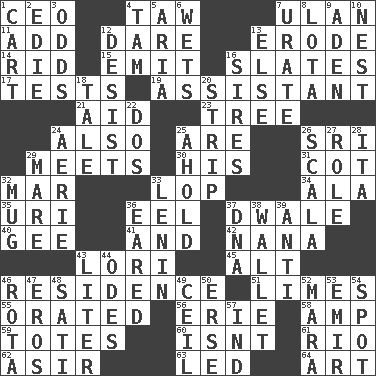 ACROSS 1. Corporate head (abbr.) 4. The 23rd letter of the Hebrew alphabet 7. ____ Bator, Mongolia 11. Find the sum of 12. Have the gumption 13. Wear away 14. To free from 15. Give off 16. Chalkboards 17. Trials 19. Helper 21. Assist 23. Family _ (genealogy) 24. In addition 25. "We ___ not amused" (Victoria) 26. _ Lanka 29. Confronts 30. Part of HMS, perhaps 31. Small bed 32. Spoil 33. Trim (branches) 34. In the manner of 35. RI univ. 36. Snakelike fish 37. A sleeping potion; an opiate (poet.) 40. Turn to the right 41. Also 42. Grandmother 43. Australian parrot (variant) 45. The first octave above the treble staff 46. Home 51. Citrus fruits 55. Spoke pompously 56. 4th largest of the Great Lakes 58. Electrical Unit 59. Lugs 60. Is not 61. River (Sp.) 62. SW Saudi Arabia district 63. Directed 64. Tate display DOWN 1. Haul 2. Singer Brickell 3. Likelihood 4. Scottish cap 5. Roberta Peters solo 6. Moistens 7. A salt of uric acid 8. Globular water bottle used in Asia 9. An important port of Yemen 10. A home for chicks 12. Cease 13. Otherwise 16. Fathers 18. Lie 20. Remove all contents or possession from 22. Two (Sp.) 24. Nest on high 25. Hold, grip (Informal) 26. Any of the three canals of the cochlea 27. Hero or heavy, e.g. 28. Call ___ day 29. Female horse 32. Java container 33. Soviet premier 1918-24 36. Having ears or earlike features 37. Heredity factor (abbr.) 38. Place for singles 39. Against 43. 61 cubic inches 44. Lyric poems 46. Roll call or roster of names 47. Greek god of love 48. Suttee (variant) 49. To provide with a ceiling 50. Celtic language 52. Hindu Mythology: god of death 53. Independent ruler or chieftain 54. Specific locale 57. Indiana (abbr.)