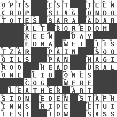ACROSS 1. Elects 5. Eastern Standard Time (abbr.) 8. Adolescent 12. Riding implement 13. Volcanic refuse 15. Southwest Nigerian state 16. Hauls 18. "Two Mules for Sister ____" 19. The sixth month of the Jewish calendar 20. Keyboard modifier key 22. Mood resulting from idleness 24. Peachy ____! 26. 24 hours 27. Pulitzer Prize-winning author Ferber 28. Dripping 29. ___ a Wonderful Life 32. Russian ruler 35. Ache 37. "Barney Miller" actor Jack 38. Lubricates 39. Baking dish 40. Wise men 41. Friend of Pooh 42. Froth on beer 43. Mountain range 44. Single 45. Hat (slang) 46. Washington bills 49. Gear tooth 50. Past tense of be (plural) 51. Cordwainer's material 55. Tate display 56. The Jewish people; Israel 57. Genesis locale 59. Staphylococcus 63. Lodging establishments 64. Travel on or in a vehicle 65. Needle holder 66. Trial 67. Pull behind 68. Backtalk DOWN 1. Sep. follower 2. Adept person 3. Small child 4. Orators 5. Double-curved letter 6. Broad, flat, thick piece 7. Pacific island yam 8. Sycophant 9. Inside; within (prefix) 10. Dutch treat 11. And not 14. Place where plants grow 17. Downhill vehicle 21. Nine, plus one 23. Consume 25. Slept 28. Light entry point 29. Austrian river, tributary to the Danube 30. Ancient Roman robe 31. Land 32. "Corrida" creature 33. The Jewish people; Israel 34. Medicinal plant 36. American Automobile Association (abbr.) 40. French bagpipes 42. Having greater elevation 45. Car dealer's back yard 47. Teachers' org. 48. Blunders 49. 2nd pers. sing. pres. of can (arch.) 51. Actor's bit 52. Immeasurably long periods of time 53. Prepare for publication 54. Redecorate 56. Be seated 58. ___ Haven, CT 60. _ moment's notice (2 wds.) 61. Purulenc 62. Part of HMS, perhaps