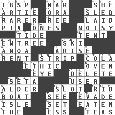 ACROSS 1. Cook's measure (abbr.) 5. Make imperfect 8. A female animal or person 11. Nick name for Arthur 13. Mouth or opening 14. Downhill vehicle 15. Less widely known 16. To sift 17. Put down 18. Parent Teacher Assoc. 19. Singles 21. Annoyingly loud 22. Periodic rise and fall of the sea level 24. Portable shelter 25. Main course 27. What Jean-Claude Killy likes to do 29. Small Philippine buffalo 30. Originate 32. Monthly bill 33. Long narrow piece of something 35. Root beer relative 39. Moral principle 41. Baking chamber 42. Sight organ 43. Erase 45. Stalk of a moss capsule 48. One who uses or employs something 49. Tree or shrub in the Birch family 50. Position in a hierarchy or organization 52. To free from 55. Water vessel 56. Observe 57. Elude 59. Capri or Wright 60. Put into a specified state 61. Consumed 62. Definite Article 63. Double-curved letter 64. Afternoon social gatherings DOWN 1. Canvas cover 2. Naughty child 3. Ski resort town in Vermont 4. Sliced dessert 5. Greater amount 6. Ancient Greek god of war 7. Actress Charlotte 8. Killed 9. Robbery 10. Whirlpool 12. Wear away 14. A type of plum 20. Born 21. Nuclear Threat Initiatives 23. Feeling or showing extreme anger 25. Ewer handle 26. Compass dir. 27. Indian title of respect (Mr.) 28. Sleep 30. Curve 31. Learning spot: Fr. 33. Like a shrinking violet 34. Standoff 36. Make much ado about nothing 37. Allow 38. A saturated hydrocarbon 40. Pull apart 43. Superhero pair 44. First name in cosmetics 45. Agitate, as a liquid 46. Peak District village in England 47. Wig 49. "This won't hurt ____!" 50. Observes 51. Allows 53. The content of cognition 54. Habitations of wild animals 56. Compass dir. 58. Large container
