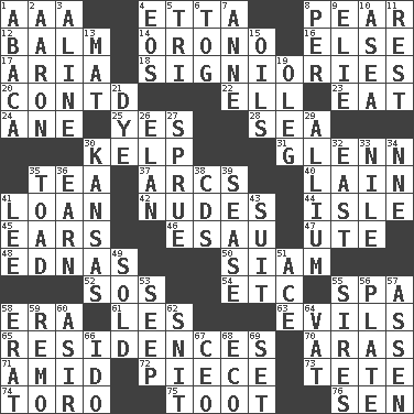 ACROSS 1. American Automobile Association (abbr.) 4. Singer James 8. Lightbulb-shaped fruit 12. Lip ointment 14. U. of Maine site 16. Otherwise 17. Roberta Peters solo 18. Seigniories (variant) 20. Continued (abbr.) 22. Pipe bend 23. Consume 24. A saturated hydrocarbon 25. Affirmative reply 28. Ocean 30. Seaweed 31. American astronaut and politician John 35. Afternoon social gathering 37. Arches 40. (Had) reclined 41. Grant temporary use of 42. Unclothed pictures 44. Small island 45. Hearing organs 46. Son of Isaac 47. Shoshoni 48. Ferber et al. 50. Thailand, formerly 52. Distress signal 54. And so on (abbr.) 55. Health resort 58. Epoch 61. French article 63. Vices 65. Dwellings 70. Caspian sea tributary 71. Among 72. Part 73. Wig 74. "Corrida" creature 75. A blast of a horn 76. Elected rep. DOWN 1. Phillipine bananalike plant 2. Composer Copland 3. Place in a line 4. Greek goddess of the dawn 5. Three (prefix) 6. Coat; cloak 7. Queen of England 1702-14 8. For each 9. Writer Wiesel 10. At sea 11. Respite 13. Floor covering 15. Lubricates 19. Cassini of fashion 21. Color 26. Style 27. Upset 29. Plant genus of onion and garlic 30. Sunflower state 32. Compass direction 33. Mediterranean tributary 34. Compass dir. 35. Frog relative 36. Merit 38. Music discs 39. Gospel singer Marvin 41. Area sheltered from the wind 43. Costume for a special activity 49. Exchanged or delivered for money 51. Adept person 53. Ooze 55. Fathers 56. Food holder 57. NE Netherlands city 58. Part of Q.E.F. 59. San ____ (Riviera town) 60. SW Saudi Arabia district 62. In a ____ (agitated or irritated) 64. Large container 66. Wedding promise 67. Corporate head (abbr.) 68. Environmental prefix 69. Arrange properly for use
