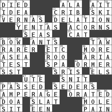 ACROSS 1. Passed on 5. In the manner of 8. Small island 11. It may be bright or harebrained 12. Baby bed with high sides 13. What Jean-Claude Killy likes to do 14. Actresses Bloom and Felton 17. Accusation by an informer 19. Gossips 21. Oak nuts 22. Oceans 23. Domesticated feline 24. Arrow shooter 27. Pismires 29. The 23rd letter of the Hebrew alphabet 32. More uncommon 34. And so on (abbr.) 36. Greater amount 37. At sea 38. Friend of Pooh 39. Roberta Peters solo 40. Trial 41. Health resort 42. Channel Islands abalone 43. Fast jet (abbr.) 44. Indian titles of respect 46. Raised railways 47. Shoshoni 50. In a ____ (agitated or irritated) 52. Went by 55. Spring feasts 57. Electrical Measurement 59. Declaimed 62. ___ good deed 63. Narrow board 64. Undercover agent 65. Be seated 66. Car or cant ending 67. Ache DOWN 1. HTML Container Element 2. Binary compound 3. Suggestive of the supernatural 4. Natives or inhabitants of Denmark 5. "We ___ not amused" (Victoria) 6. Pale purple color 7. Phillipine bananalike plant 8. SW Saudi Arabia district 9. Visual representation of an object 10. Airtight sealed metal containers 12. Music discs 15. Approach 16. Comedian Laurel of Laurel & Hardy 18. Small child 20. Michaelmas daisies 24. Naughty children 25. Fertile tracts in a desert 26. Obtain by seizing forcibly or violently 28. Closes up, plugs up 29. Singer Mel 30. Satellite of Uranus 31. Erodes 33. Erode 35. Rough 36. Make imperfect 42. Flexible twig of a willow tree 45. Southeast Asian peninsula 47. Purpose 48. Laconic 49. Peak District village in England 51. _____ steamer (cargo ship) 52. Writing tablets 53. Mine, in Marseilles 54. Petty quarrel 55. Put into a specified state 56. Portico 58. Separate the seeds from cotton 60. Connecticut Ivy Leaguer 61. Lair