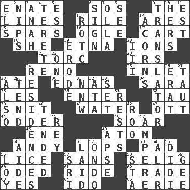 ACROSS 1. Maternal 6. Distress signal 9. Definite Article 12. Citrus fruits 13. Cause heat under the collar 14. Ancient Greek god of war 15. Practice fights 16. Stare 17. Heavy open wagon 18. A female animal or person 19. Inactive volcano in Sicily 20. Charged atoms 21. Torque (variant) 23. Big collection agency 24. Former U.S. Attorney General Janet 25. An arm off of a larger body of water 28. Had dinner 30. Ferber et al. 34. "Two Mules for Sister ____" 35. French article 36. Keyboard key 38. The 19th letter of the Greek alphabet 39. In a ____ (agitated or irritated) 41. Wetness 43. Baseball player Mel 44. More peculiar 46. Fly high 48. Compass dir. 49. Smallest unit of an element 50. "60 Minutes" Commentator Rooney 51. Chops off 53. Writing tablet 56. Louse (plural) 57. Without 58. Former Milwaukee Brewers owner Bud 60. Wrote a lyric poem 61. Travel on an animal 62. Barter 63. It is so 64. Wedding promise 65. Nest on high DOWN 1. Raised railways 2. Pinches, bites 3. Wet nurse 4. Cylindrical with tapered ends 5. Curvy letter 6. Attach a signature 7. Rounded earthenware pot or jar 8. Perceive with the eye 9. Interpreter 10. Possessive pronoun 11. Eastern Standard Time (abbr.) 13. College mil. group 14. Oak nuts 19. Wear away 20. One more than two 22. Single 24. Dwellings 26. Part of Q.E.F. 27. Strained 28. In addition 29. Look after 31. Compass dir. 32. _ moment's notice (2 wds.) 33. Arrange properly for use 37. Musical pauses 40. Looked after 42. Friend of Pooh 45. Marina Del _, California 47. Electrical Unit 49. Domed church section 50. Assistant 51. Put down 52. Southwest Nigerian state 54. Having or resembling wings 55. "You Light Up My Life" star Conn 56. Myrna of the movies 57. _ Lanka 58. R.R. building 59. Turn to the right