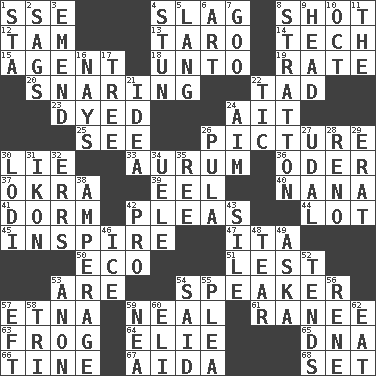 ACROSS 1. Compass dir. 4. Volcanic refuse 8. Opportunity 12. Scottish cap 13. Pacific island yam 14. Technology 15. Rep 18. To (old English) 19. Assign a rank or rating to 20. Catching in a trap 22. Bit 23. Colored 24. Small island 25. Perceive with the eye 26. Photo 30. Falsehood 33. Gold (Symbol: Au) 36. Baltic tributary 37. Gumbo ingredient 39. Snakelike fish 40. Nanny 41. Dormintory (informal) 42. Entreaties 44. Car dealer's back yard 45. Stimulate to action 47. Call ___ day 50. Environmental prefix 51. For fear that 53. "We ___ not amused" (Victoria) 54. Orator 57. Inactive volcano in Sicily 59. Be tempered by heat 61. The wife of a rajah (variant) 63. Toadlike animal 64. Writer Wiesel 65. Heredity factor (abbr.) 66. Prong on a fork 67. Opera by Verdi 68. Put into a specified state DOWN 1. R.R. building 2. Sinks 3. Make improvements or corrections to 4. Astound 5. Long (Scottish) 6. Tate display 7. Thick or sticky substance 8. Ski resort town in Vermont 9. Froth on beer 10. Sep. follower 11. Definite Article 16. Negative votes 17. Woody plant 21. It may be bright or harebrained 22. Nervous spasm 24. Direct toward a target or goal 26. Monetary unit of Botswana 27. Freehold land 28. Western Nevada city 29. Part of Q.E.F. 30. Farming town in central California 31. Visual representation of an object 32. Blunders 34. Ubangi River tributary 35. To separate or throw off 38. Electrical Measurement 42. Adept person 43. Drop; flow; fall 46. Frozen water 48. Rend 49. "____ silly question..." 52. Is inclined (to) 53. At once, immediately (arch.) 54. Expressed in words 55. Entreaty 56. French philosopher Descartes 57. Lizard (obsolete) 58. Three (prefix) 59. Teachers' org. 60. Connecticut Ivy Leaguer 62. Consume