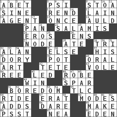 ACROSS 1. Collude with 5. 23rd letter of the Greek alphabet 8. Portico 12. Trig term 13. Tear apart 15. (Had) reclined 16. Rep 18. At one time in the past 19. Old (Scot.) 20. Baking dish 22. Deli grouping 24. Greek god of love 26. Followers of ems 27. Thickened enlargement 28. Had dinner 29. Three (prefix) 32. Actor Alda or Thicke 35. Otherwise 37. Part of HMS, perhaps 38. Rowboat 39. Plant holder 40. Relating to the mouth 41. Tate display 42. False hair 43. Short-tailed, large-bodied rat 44. To sift 45. Directed 46. Loose flowing garment 49. Victory 50. Coast Guard woman 51. Mood resulting from idleness 55. Affectionate concern, for short 56. Travel on an animal 57. Part of Q.E.F. 59. Methods 63. Sums up 64. Have the gumption 65. Cause to be 66. Inconspicuous attention getter 67. Teachers' org. 68. Locale of original sin DOWN 1. White ___ sheet 2. Massive 3. Compass dir. 4. 3-inch nail 5. Adept person 6. Elected reps. 7. South American Indian 8. Hits or strikes with great force 9. "Change" in Tahitian 10. Lubricates 11. Also 14. Erase 17. Edible starchy tuberous root 21. Allow head to fall sleepily 23. A saturated hydrocarbon 25. Oozed 28. Michaelmas daisies 29. Through, poetically 30. Monetary unit of Yemen 31. Small island 32. The sixth month of the Jewish calendar 33. Old wives' tales, e.g. 34. Johnson of "Laugh-In" 36. Car dealer's back yard 40. Conquer 42. Watched over 45. Whopper 47. Choose 48. Lip ointment 49. Obtain by seizing forcibly or violently 51. Auction offers 52. Likelihood 53. NW Algerian seaport 54. Female horse 56. Reproach for some lapse or misdeed 58. Afternoon social gathering 60. June honoree 61. Supplement with great effort 62. Elected rep.