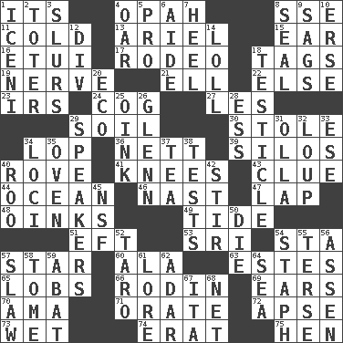 ACROSS 1. ___ a Wonderful Life 4. Brightly colored fish 8. Compass dir. 11. Lacking warmth 13. Satellite of Uranus 15. Hearing organ 16. Needle holder 17. Cowboy competition 18. Labels 19. Effrontery 21. Pipe bend 22. Otherwise 23. Big collection agency 24. Gear tooth 27. French article 29. Land 30. Fur scarf 34. Chop off 36. Remaining after all deductions 39. Grain storage towers 40. Be footloose 41. Leg joints 43. A slight indication 44. Sea 46. Political cartoonist Thomas 47. Pet locale 48. Pig sounds 49. Periodic rise and fall of the sea level 51. Bank Draft (abbr.) 53. _ Lanka 54. R.R. building 57. Play the lead 60. In the manner of 63. _____ Park, CO 65. Tennis shots 66. "The Thinker" sculptor 69. Hearing organs 70. Housemaid (var.) 71. Speak pompously 72. Domed church section 73. Dripping 74. Part of Q.E.F. 75. Layer DOWN 1. Ancient Celtic tribe of eastern Britain 2. Carrier 3. Disparaging remarks 4. Rowing implement 5. Adept person 6. Helper 7. The bottom of a shoe or boot 8. Lick closed 9. Droops 10. Celtic language 12. HTML Container Element 14. Hang loosely or laxly 18. A testis 20. Environmental prefix 25. Pig sound 26. American astronaut and politician John 28. Double-curved letter 29. Orators 31. Water jar 32. Central Nebraska county 33. Compass dir. 34. Venues 35. Baking chamber 37. Beverage made from leaves 38. Trials 40. Friend of Pooh 42. Agitate 45. Science/research agcy. 50. Pass on 52. Pacific island yam 54. Staphylococcus 55. Laconic 56. NE Netherlands city 57. Cole _ (cabbage dish) 58. Heavy book 59. Blind as ____ 61. Old wives' tales, e.g. 62. The sixth month of the Jewish calendar 64. Ocean 67. Call ___ day 68. Fish or hair follower