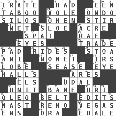 ACROSS 1. Feeling or showing extreme anger 6. Possessed 9. Car or cant ending 12. Off limits 13. Short-tailed, large-bodied rat 14. Southwest Nigerian state 15. Grain storage towers 16. Sign of things to come 17. Tumult 18. Fish or hair follower 19. _ gin 20. 1/640 square mile 21. Argument over a trivial matter 23. Actress Charlotte 24. Sight organs 25. Swap 28. Writing tablet 30. Amusement-park features 34. Portico 35. Black tropical American cuckoo 36. Music written for nine 38. Big collection agency 39. Ear part 41. Gospel singer Marvin 43. Sight organ 44. Shopping centers 46. Ancient Greek god of war 48. Raised railways 49. Freehold land 50. A single undivided whole 51. Object of repulsion 53. RI univ. 56. Butter sub 57. Waist strap 58. Prepares for publication 60. Political cartoonist Thomas 61. San ____ (Riviera town) 62. Viva Las _ 63. Followers of ems 64. Mouth or opening 65. Peak District village in England DOWN 1. It is 2. Precipitation 3. Competent 4. A girl or young woman (variant) 5. Greek goddess of the dawn 6. Like (prefix) 7. Toward shelter 8. Lair 9. Pleas 10. Singer Brickell 11. Not either 13. Electrical Unit 14. Motion picture awards 19. Indian antelope 20. Tate display 22. For each 24. The property of being fit to eat 26. Dinghy 27. Comfort 28. Inside of hand 29. Small Philippine buffalo 31. Two (Sp.) 32. Compass dir. 33. Ocean 37. Sadhe (variant) 40. American author Paul (1891-1958) 42. Period 45. Fast jet (abbr.) 47. Evaded 49. To (old English) 50. Uhlan (variant) 51. Fermented drink made from hops 52. _ mater 54. Port city in Latvia 55. Slanted text style (abbr.) 56. Single 57. Sis' sibling 58. Night before a holiday 59. Compass dir.