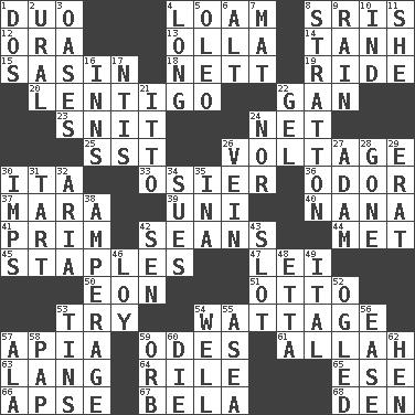 ACROSS 1. Superhero pair 4. Rich soil 8. Indian titles of respect 12. Mouth or opening 13. Rounded earthenware pot or jar 14. Hyperbolic tangent 15. Indian antelope 18. Remaining after all deductions 19. Travel on or in a vehicle 20. Small, flat, pigmented spot on the skin 22. Separate the seeds from cotton 23. In a ____ (agitated or irritated) 24. Fish or hair follower 25. Fast jet (abbr.) 26. Electrical Measurement 30. Call ___ day 33. Flexible twig of a willow tree 36. Aroma 37. Hindu Mythology: god of death 39. Single; one (prefix) 40. Nanny 41. Demure 42. Actors Connery and Penn 44. Was introduced to 45. Paper fasteners 47. Luau accessory 50. Age 51. "Beetle Bailey" pooch 53. Attempt to accomplish something 54. Electrical Measurement 57. Capital of Western Samoa 59. Lyric poems 61. Assad's deity 63. Austrian-born American filmmaker Fritz 64. Cause heat under the collar 65. Compass dir. 66. Domed church section 67. Actor Lugosi 68. Lair DOWN 1. Two (Sp.) 2. Mountain range 3. Fertile tracts in a desert 4. Having great length 5. Butter sub 6. Keyboard modifier key 7. Floor protector 8. Ski resort town in Vermont 9. Water falling in drops from the sky 10. Working for oneself (abbr.) 11. A female animal or person 16. Lodging establishments 17. Nuclear Threat Initiatives 21. "Tell ____ the Marines!" 22. Set 24. Or not 26. Distinctive style or manner 27. First of billions? 28. Went 29. Part of Q.E.F. 30. Naughty children 31. Small pie 32. Operatic vocal solo 34. Institutes legal proceedings 35. _ tizzy (2 wds.) 38. Electrical Measurement 42. Elected rep. 43. Groove 46. Myrna of the movies 48. Singer James 49. Slanted text style (abbr.) 52. Stared at amorously 53. Metal containers 54. Water source 55. Toward the sea 56. Comfort 57. According to 58. Infant food 59. Globe 60. Expire 62. Layer