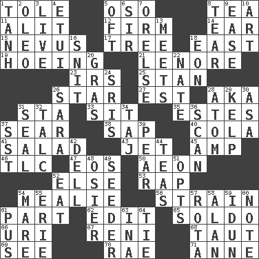ACROSS 1. Lacquered or enameled metalware 5. Bear (Spanish) 8. Afternoon social gathering 11. Set down 12. Not soft or yielding to pressure 14. Ewer handle 15. Mole, birthmark 17. Woody plant 18. 90 degrees 19. Cultivating 21. Poe poem 23. Big collection agency 25. Comedian Laurel of Laurel & Hardy 26. Play the lead 27. Eastern Standard Time (abbr.) 28. Alias (abbr.) 31. R.R. building 33. Be seated 35. _____ Park, CO 37. Shrivel 38. Plant excrement 40. Root beer relative 41. Vegetable dish 43. Type of plane 45. Electrical Unit 46. Affectionate concern, for short 47. Greek goddess of the dawn 50. Age 52. Otherwise 53. Strike 54. Ear of corn 56. Put through a sieve 61. Role in a play 62. Prepare for publication 65. Twentieth part of a lira 66. RI univ. 67. Painter Guido (1575-1642) 68. Pulled tight 69. Observe 70. Actress Charlotte 71. Queen of England 1702-14 DOWN 1. Hyperbolic tangent 2. Margarine 3. Not recorded 4. Needle case 5. Often (poetically) 6. Title for a knight 7. Threatening words 8. Pull apart 9. Comfort 10. Tate display 13. Confronts 16. In a ____ (agitated or irritated) 18. A really long time 20. Pate de foie ____ 22. Nathan's nickname 24. Indian titles of respect 26. "Two Mules for Sister ____" 28. Tiny particle 29. Seaweed 30. White ___ sheet 31. Lick closed 32. Baby powder 34. _ Mahal 36. Examine minutely or intensely 37. Fast jet (abbr.) 39. Lightbulb-shaped fruit 42. Small valley 44. Beverages made from leaves 48. Flexible twig of a willow tree 49. Sowing specialist 51. Elects 52. Erode 54. Female horse 55. 4th largest of the Great Lakes 57. Roll call or roster of names 58. Actor Alda or Thicke 59. Goddess of spring and wife of Bragi 60. Musical sound 61. Tenth month of the Hindu calendar 63. _ tizzy (2 wds.) 64. Make a knot