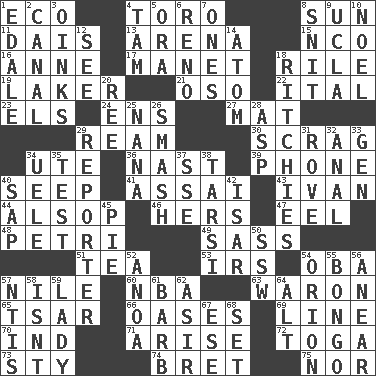 ACROSS 1. Environmental prefix 4. "Corrida" creature 8. Player for Phoenix 11. Raised platform 13. Sports stadium 15. Non-commissioned officer (abbr.) 16. Queen of England 1702-14 17. French painter Edouard 18. Cause heat under the collar 19. Member of a famous L.A. basketball team 21. Bear (Spanish) 22. Slanted text style (abbr.) 23. Raised railways 24. Followers of ems 27. Floor protector 29. 480, 500 or 516 sheets of paper 30. Lean end of the neck 34. Shoshoni 36. Political cartoonist Thomas 39. Give a jingle 40. Ooze 41. Slender Brazilian palm 43. "Terrible" tsar 44. Columnist Joseph or Stewart 46. Possessive pronoun 47. Snakelike fish 48. _ dish (used to culture cells) 49. Backtalk 51. Afternoon social gathering 53. Big collection agency 54. Chief or king in Benin or Nigeria 57. The longest river in the world 60. Basketball assoc. 63. Make _____ (do battle with) 65. Russian ruler of old 66. Fertile tracts in a desert 69. Actor's bit 70. Working for oneself (abbr.) 71. Ascend 72. Ancient Roman robe 73. Filthy place 74. Cy Young winner Saberhagen 75. And not DOWN 1. Peak District village in England 2. Lessep's creation 3. Pig sounds 4. Scottish cap 5. Mouth or opening 6. Former U.S. Attorney General Janet 7. Washington bills 8. In a ____ (agitated or irritated) 9. Southern CA. univ. 10. Christmas carol 12. Observe 14. Smallest unit of an element 18. Actors Guy, Robert Welles, and Clint 20. To separate or throw off 25. Nanny 26. Box-office sellout 28. Cleo's killer 29. News announcer 31. Be footloose 32. Of or related to the anus 33. Commissioned military rank (abbr.) 34. Ubangi River tributary 35. Trial 37. Compass dir. 38. Tarsus (plural) 40. Plant excrement 42. Austrian river, tributary to the Danube 45. Sliced dessert 50. Compass dir. 52. Small Philippine buffalo 54. Constellation of myth 55. Beat drum 56. Approach 57. Nuclear Threat Initiatives 58. Is not 59. Kenny Rogers chart-topper in '80 61. Sharp remark 62. SW Saudi Arabia district 64. The first octave above the treble staff 67. Compass dir. 68. Arrange properly for use