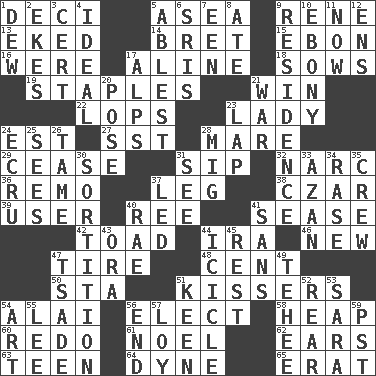 ACROSS 1. Tenth: prefix 5. Toward the sea 9. French philosopher Descartes 13. Made supply last 14. Cy Young winner Saberhagen 15. Inky black, to poets 16. We are 17. Place in a line 18. Sty mamas 19. Paper fasteners 21. Victory 22. Chops off 23. Kenny Rogers chart-topper in '80 24. Eastern Standard Time (abbr.) 27. Fast jet (abbr.) 28. Female horse 29. Stop 31. Small drink 32. Drug cop 36. San ____ (Riviera town) 37. Part of a journey 38. Russian ruler of old 39. One who makes use of a thing 40. Portuguese money of account (variant) 41. Gospel singer Marvin 42. Frog relative 44. Lyricist Gershwin 46. ___ Haven, CT 47. Become fatigued 48. Penny 50. R.R. building 51. Smoochers 54. Jai _ 56. Choose 58. Pile 60. Make new 61. Christmas carol 62. Hearing organs 63. Adolescent 64. Unit of force 65. Part of Q.E.F. DOWN 1. Morning condensation 2. Makes supply last 3. Foregone conclusion 4. Standard of perfection 5. Most capable 6. Indian titles of respect 7. Car or cant ending 8. Had dinner 9. Home 10. Dark wood 11. Immediately 12. Followers of ems 17. High mountains 20. Introduce or present, as a question 21. Armed conflict 23. Pet locale 24. Shade of tan 25. Observes 26. Docile 28. Russian fighter aircraft 30. Drawing lots 31. Perceive with the eye 33. Muslim summons to prayer 34. Raze (variant) 35. Ship's personnel 37. Directed 40. Actress Charlotte 41. Without 43. Mouth or opening 44. Ice on the eave 45. Respite 47. Sadhe (variant) 49. Giggle 51. Peachy ____! 52. Hitchcock's "____ Window" 53. "Two Mules for Sister ____" 54. Nonscientific branch of learning 55. Area sheltered from the wind 56. Conclude 57. Myrna of the movies 59. Pacific Standard Time (abbr.)