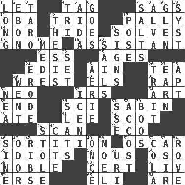 ACROSS 1. Allow 4. Label 7. Sinks 11. Chief or king in Benin or Nigeria 12. Musical group of three 13. Friendly 14. Not either 15. Flintstone garb 16. Finds the solution 17. Dwarf 19. Helper 21. Curvy letter 23. Ripens 24. Singer Brickell 25. The 18th letter of the Arabic alphabet 26. Beverage made from leaves 29. Obtain by seizing forcibly or violently 30. Raised railways 31. Reproach for some lapse or misdeed 32. Modern: prefix 33. Big collection agency 34. Nonscientific branch of learning 35. Conclusion 36. _-fi 37. Unit of acoustic absorption 40. Had dinner 41. Area sheltered from the wind 42. Highlander 43. Skim 45. Environmental prefix 46. Conclusion 51. Witty Wilde 55. Foolish or stupid persons 56. Horse sense 58. Bear (Spanish) 59. Having high moral qualities 60. An absolute certainty 61. 54 in ancient Rome 62. Celtic language 63. Biblical high priest 64. "We ___ not amused" (Victoria) DOWN 1. Yearn 2. Inky black, to poets 3. Pacific island yam 4. Three (prefix) 5. Opera by Verdi 6. Travels 7. Table seasonings 8. Inventor's middle name 9. Small, secluded valley 10. System (abbr.) 12. College paper 13. Introduce or present, as a question 16. Attaches a signature 18. Ancient Persian 20. Moves on water 22. Arrange properly for use 24. Wear away 25. Nest on high 26. Distinguishing feature 27. Merit 28. Fitting 29. Gone 32. Teachers' org. 33. Ancient Celtic tribe of eastern Britain 36. Narrow boards 37. Compass dir. 38. Buttonhole 39. Expressions of contempt or scorn 43. Fur scarf 44. Quote 46. Trig term 47. Scent 48. Chest bones 49. Single time 50. Christmas carol 52. Root beer relative 53. SW Saudi Arabia district 54. Be footloose 57. RI univ.