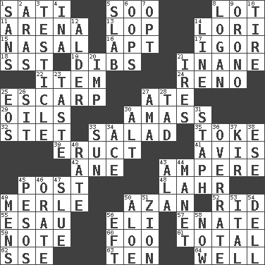 ACROSS 1. Suttee (variant) 5. "Barney Miller" actor Jack 8. Car dealer's back yard 11. Sports stadium 13. Chop off 14. Australian parrot (variant) 15. Relating to the nose 16. Fitting 17. Composer Stravinsky 18. Fast jet (abbr.) 19. Rights 21. Lacking in sense or substance 22. A whole individual unit 24. Former U.S. Attorney General Janet 25. Fortification 27. Had dinner 29. Lubricates 30. Collect or gather 32. Proofreading order 33. Vegetable dish 35. Puff or smoke 39. Spew [out] 41. Opinion 42. One (Scot) 43. Electrical Unit 45. Mail 48. Cowardly lion portrayer 49. Haggard of country music 50. Muslim summons to prayer 52. To free from 55. He sold his birthright 56. Connecticut Ivy Leaguer 57. Maternal 59. Short letter 60. Egg _ yung 61. "_____ Recall" 62. Compass dir. 63. Nine, plus one 64. Water source DOWN 1. Without 2. Caspian sea tributary 3. One of the two male reproductive glands 4. _ tizzy (2 wds.) 5. Thick slice 6. I made a mistake 7. Elect 8. Utah city north of Ogden 9. U. of Maine site 10. Become fatigued 12. Tree or shrub in the Birch family 14. Actor's bit 20. Mischievous child 21. Angers 23. Clothes sense 25. Greek goddess of the dawn 26. Be seated 27. Nanny (var.) 28. Small amount or degree 30. The first octave above the treble staff 31. Staphylococcus 33. Player for Phoenix 34. Adept person 36. Make much ado about nothing 37. Apertif with cassis 38. Compass dir. 40. Assign a rank or rating to 43. Chicken ___ king 44. French painter Edouard 45. Mexican monetary units 46. Declaim 47. Turn sharply 49. Not women's 50. Medicinal plant 51. The Jewish people; Israel 53. Slanted text style (abbr.) 54. Small valley 56. Newt 58. At this time