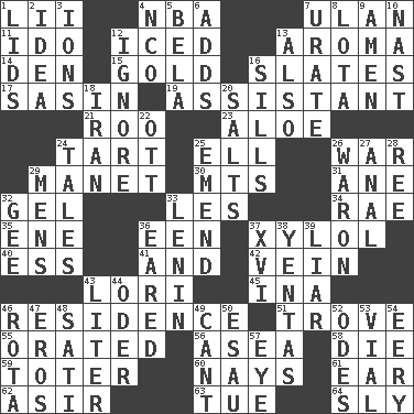 ACROSS 1. Cards in a Roman deck? 4. Basketball assoc. 7. ____ Bator, Mongolia 11. Wedding promise 12. On the rocks 13. Scent 14. Lair 15. Gilded 16. Chalkboards 17. Indian antelope 19. Aide 21. Friend of Pooh 23. Medicinal plant 24. Small pie 25. Pipe bend 26. Armed conflict 29. French painter Edouard 30. Mountains (abbr.) 31. One (Scot) 32. Set 33. French article 34. Actress Charlotte 35. Compass dir. 36. Car or cant ending 37. Xylene (variant) 40. Curvy letter 41. Plus 42. Distinctive style or manner 43. Australian parrot (variant) 45. _ tizzy (2 wds.) 46. Home 51. Collection of objects 55. Spoke pompously 56. At sea 58. Expire 59. Carrier 60. Negative votes 61. Ewer handle 62. SW Saudi Arabia district 63. Third day of the wk. 64. Mischievous DOWN 1. Flaplike coverings 2. It may be bright or harebrained 3. Charged particles 4. Non-commissioned officer (abbr.) 5. Actor Lugosi 6. Does sums 7. A salt of uric acid 8. Globular water bottle used in Asia 9. So be it 10. Political cartoonist Thomas 12. Refuse to acknowledge 13. In addition 16. Beverly of Met fame 18. SW Asia republic 20. Table seasonings 22. Baseball player Mel 24. Falsehoods 25. Make improvements or corrections to 26. Make _____ (do battle with) 27. Of or related to the anus 28. To separate or throw off 29. Not women's 32. Turn to the right 33. Soviet premier 1918-24 36. Having ears or earlike features 37. 16 38. Gossips 39. One who doesn't tell the truth 43. 61 cubic inches 44. Baltic tributary 46. Round or rotation of duties 47. Greek god of love 48. Suttee (variant) 49. Patter 50. He sold his birthright 52. Lyric poems 53. Small bottle 54. Suggestive of the supernatural 57. Sight organ