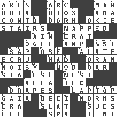 ACROSS 1. Ancient Greek god of war 5. Curve 8. Impair 11. Roll call or roster of names 12. "Vaya con ____" 14. Wet nurse (var.) 15. Continued (abbr.) 17. Dormintory (informal) 18. Migrant worker of the '30s 19. Flight of steps 21. Slept 23. The 18th letter of the Arabic alphabet 25. Part of Q.E.F. 26. Stare at amorously 27. Electrical Unit 28. Fast jet (abbr.) 31. Plant excrement 33. Order of Saint Francis (abbr.) 35. Having winglike extensions 37. Shade of tan 38. Possessed 40. NW Algerian seaport 41. Annoyingly loud 43. Dreamland 45. Boat paddle 46. R.R. building 47. Compass dir. 50. A home for chicks 52. Silent film actress Nazimova 53. Affectionate concern, for short 54. Window treatments 56. Portable computer 61. Greek goddess of the earth (variant) 62. Tenth: prefix 65. Typical standards 66. Epoch 67. Narrow board 68. Takes to court 69. Snakelike fish 70. Health resort 71. Portable shelter DOWN 1. Curves 2. Carrot, for example 3. Inactive volcano in Sicily 4. Suttee (variant) 5. Say or write further 6. River (Sp.) 7. Pupil covering 8. Cause to be 9. Among 10. Actress Charlotte 13. Excessive but superficial compliments 16. To be drawn or hauled along 18. Elect 20. Grain storage tower 22. Dad 24. Soft 26. Musical composition 28. "Two Mules for Sister ____" 29. Play the lead 30. Nine, plus one 31. Highlander 32. Operatic vocal solo 34. Air blower 36. Plunder 37. Followers of ems 39. Do not 42. Sharp bark 44. Small valley 48. Bobsleighs 49. Artist's stands 51. Examine hastily 52. Auto club (abbr.) 54. Have the gumption 55. Monetary unit of Yemen 57. Mail 58. Loyal 59. Sign of things to come 60. Inconspicuous attention getter 61. Turn to the right 63. Head covering 64. Call ___ day