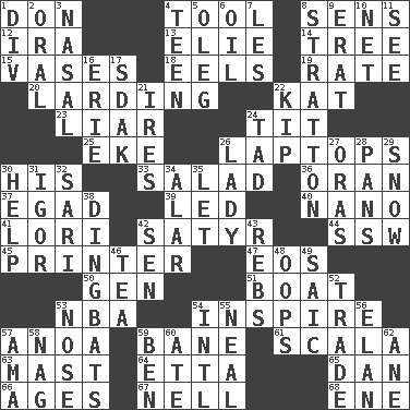 ACROSS 1. Spanish title 4. Instrument 8. Elected reps. 12. Lyricist Gershwin 13. Writer Wiesel 14. Relationship diagram 15. Flower holders 18. Snakelike fish 19. Assign a rank or rating to 20. Preparing or cooking with lard 22. Krazy ___ of comics 23. One who doesn't tell the truth 24. Teat (slang) 25. Make supply last 26. Portable computers 30. Part of HMS, perhaps 33. Vegetable dish 36. Northwest Algerian city 37. Mild oath 39. Directed 40. Billionth: prefix 41. Australian parrot (variant) 42. Letch 44. Compass dir. 45. Hard copy producer 47. Greek goddess of the dawn 50. Commissioned mil. rank 51. Water vessel 53. Basketball assoc. 54. Motivate 57. Small Philippine buffalo 59. Object of repulsion 61. Any of the three canals of the cochlea 63. Vertical spar for supporting sails 64. Singer James 65. Daniel's nick name 66. Matures 67. 1994 drama film starring Jodie Foster 68. Compass dir. DOWN 1. HTML Container Element 2. Of the mouth 3. Rhinal 4. Adolescent 5. Cassini of fashion 6. Lubricate 7. French article 8. Ski resort town in Vermont 9. Part of Q.E.F. 10. Fish or hair follower 11. Observe 16. One of the Great Lakes 17. Neighbor of Neb. 21. Angers 22. Sleep 24. Small boy 26. Kenny Rogers chart-topper in '80 27. Mouths or openings 28. Zero-star reviews 29. Frozen precipitation 30. Aid 31. Composer Stravinsky 32. Indian skirt 34. Having or resembling wings 35. Allow 38. Empty-headed or silly people 42. Elected rep. 43. Confederate soldiers (slang) 46. Beverage made from leaves 48. I made a mistake 49. Ketch in the Levant 52. Swap 53. Characteristic smell of wine 54. International (abbr.) 55. Be tempered by heat 56. Liveliness 57. Housemaid (var.) 58. Tired old horse 59. Benjamin's nick name 60. Had dinner 62. One (Scot)