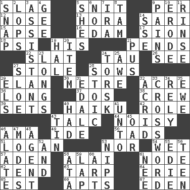 ACROSS 1. Volcanic refuse 5. In a ____ (agitated or irritated) 9. For each 12. Characteristic smell of wine 13. Israeli folk dance 14. Indian skirt 15. Domed church section 16. Dutch treat 17. The Jewish people; Israel 18. Air pressure measure (abbr.) 19. Part of HMS, perhaps 21. Depends 22. Narrow board 24. The 19th letter of the Greek alphabet 26. Observe 27. Fur scarf 28. Sty mamas 29. Flair 30. Distance measurement (Brit.) 32. Measure of real estate 36. Protracted 37. Two (Sp.) 38. Group working together 39. Arranges properly for use 40. Japanese poetic form 42. Hero or heavy, e.g. 43. Baby powder 44. Annoyingly loud 46. Housemaid (var.) 49. Binary compound 50. Small amounts or degrees 51. Utah city north of Ogden 53. And not 54. Soggy 57. Arabian gulf 58. Mountain range southwest of Kyrgyzstan 61. Thickened enlargement 62. Watch over 63. Canvas cover 64. 4th largest of the Great Lakes 65. Eastern Standard Time (abbr.) 66. Tenement units (abbr.) 67. Paradise DOWN 1. Fastener 2. Chops off 3. Helper 4. Turn to the right 5. "______ My Girl" (Turtles hit) 6. Lower and raise head in agreement 7. Lyricist Gershwin 8. Scottish cap 9. Aches 10. Wear away 11. Wash lightly 14. Compass dir. 19. Actor Linden 20. A whole individual unit 21. Fluid product of inflammation 23. Yearns 24. Cod relative 25. Deep reverence 27. _ gin 28. Unemotional 29. Raised railways 31. Peak District village in England 32. Sour-tasting 33. What you're doing now 34. Depend 35. She-sheep 40. Possessed 41. To (old English) 43. Shallow baking pan 45. Boat paddle 46. Having winglike extensions 47. Methods 48. Rep 52. Also 53. Cuts off 55. Singer Brickell 56. Adolescent 58. _ moment's notice (2 wds.) 59. Pet locale 60. Tate display 61. Born