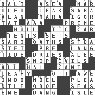 ACROSS 1. Indonesian resort city 5. Toward the sea 9. Spoil 12. Butter sub 13. Path through which fluid escapes 14. "Two Mules for Sister ____" 15. Actor Alda or Thicke 16. Hindu Mythology: god of death 17. Composer Stravinsky 18. Make lace 19. American Automobile Association (abbr.) 21. A-one 22. Frame or body of a ship 24. Nervous spasm 26. 4-wheeled motor vehicle 27. Portable shelters 28. Arranges properly for use 29. Indian skirt 30. Expletives 32. Portico 36. Proofreading order 37. Before (prefix) 38. Austrian-born American filmmaker Fritz 39. Event that recurs at intervals 40. Frees from moisture 42. Toward shelter 43. Clip 44. Vices 46. 100% 49. Actor Linden 50. Patter 51. Like summer trees 53. Baseball player Mel 54. Deep reverence 57. _ china 58. Christmas carol 61. Entreaty 62. Mediterranean tributary 63. Mitch Miller's instrument 64. Oceans 65. Compass dir. 66. Mild oath, euphamism for damn 67. Small island DOWN 1. Water vessel 2. Silent film actress Nazimova 3. Resembling or made to resemble leather 4. Electrically charged atom 5. _ mater 6. Ocean 7. Hearing organ 8. Alias (abbr.) 9. Mysterious quality of enchantment 10. Odor 11. Less widely known 14. Title for a knight 19. Keyboard modifier key 20. In addition 21. Personal Computers (abbr.) 23. Join together 24. Giggle 25. ___ a Wonderful Life 27. Jacques of French films 28. Remove all contents or possession from 29. Fast jet (abbr.) 31. Showery time 32. Killed 33. Baron Munchausen's specialties 34. Singles 35. Ripen 40. Heredity factor (abbr.) 41. Religious group 43. Like a shrinking violet 45. Large container 46. Place in a line 47. Soviet premier 1918-24 48. Dipping utensil 52. Enemy 53. Cassini of fashion 55. Welt 56. Relaxation 58. Allow head to fall sleepily 59. Chief or king in Benin or Nigeria 60. Age 61. 23rd letter of the Greek alphabet
