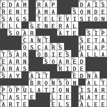 ACROSS 1. Dutch treat 5. Hit sharply and swiftly 8. Raised platform 12. Monthly bill 13. Nursemaid (var.) 14. Message 15. Settles 16. Boob tube 19. Pipe bend 20. Commissioned military rank 21. Fly high 23. Had dinner 24. Small drink 27. Patter 30. Bristle 31. Motion picture awards 34. Pile 35. Russian ruler of old 38. Off-Broadway awards 40. Silent film actress Nazimova 41. Merit 42. Flew 44. Ancient river in northeast Turkey 45. Travel on an animal 46. Declare 47. Small island 50. Pulitzer Prize-winning author Ferber 53. "Death Wish" actor 57. Keyboard modifier key 59. Census information 63. Austrian river, tributary to the Danube 64. Clothes sense 65. Untruth 66. Nathan's nickname 67. Johnson of "Laugh-In" 68. Raised railways 69. Toward shelter DOWN 1. Celtic language 2. Allots cards 3. White American of non-Hispanic descent 4. Mountains (abbr.) 5. Pace 6. So be it 7. Diluted with white 8. Two (Sp.) 9. Cuckoo 10. Wedding promise 11. Elected rep. 14. Drop; flow; fall 17. Epoch 18. Large container 20. Pate de foie ____ 22. Oak nuts 24. Stitch closed the eyes of (a falcon) 25. Slanted text style (abbr.) 26. Dad 28. Non-commissioned officer (abbr.) 29. Bar bills 30. Cast a shadow over 32. River (Sp.) 33. Wither 35. Beverages made from leaves 36. "Two Mules for Sister ____" 37. Like ___ of sunshine 39. Indian title of respect (Mr.) 43. Paradise 47. Competent 48. Retirement account (abbr.) 49. Small child 51. Rhinal 52. Having winglike extensions 54. Mediterranean tributary 55. Land 56. Singles 58. Family _ (genealogy) 59. Parent Teacher Association (abbr.) 60. Rowing implement 61. Pacific Standard Time (abbr.) 62. Shoshoni 63. _ tizzy (2 wds.)