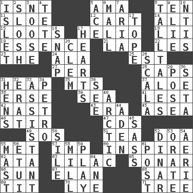 ACROSS 1. Is not 5. Wet nurse (var.) 8. "___ Little Indians" 11. A type of plum 12. Haul 14. The first octave above the treble staff 15. Plunders 17. Sun: prefix 18. Cards in a Roman deck? 19. Core 21. Pet locale 22. French article 23. Definite Article 24. In the manner of 25. Eastern Standard Time (abbr.) 27. For each 28. Balmoral and tarboosh 31. Pile 35. Mountains (abbr.) 37. _ vera 38. Celtic language 39. Ocean 41. For fear that 42. Political cartoonist Thomas 43. Period 45. Toward the sea 46. Tumult 47. Music discs 49. Mayday 51. Afternoon social gathering 52. ___ good deed 55. Was introduced to 57. Mischievous child 60. Stimulate to action 62. "One Day ___ Time" 63. Pale purple color 65. Underwater navigation system 66. Player for Phoenix 67. Flair 68. Suttee (variant) 69. Teat (slang) 70. Sodium hydroxide 71. Family _ (genealogy) DOWN 1. Small island 2. Splash clumsily 3. Trap for birds or small mammals 4. False hair 5. Adept person 6. Promenade 7. Roberta Peters solo 8. Baron Munchausen's specialties 9. Writer Wiesel 10. Nuclear Threat Initiatives 13. Drink excessively 16. Fastener 17. Centers 20. Clement's nick name 26. Any of the three canals of the cochlea 29. Airs 30. Stalk of a moss capsule 31. Coop moms 32. Part of Q.E.F. 33. Aide 34. Stone: prefix 36. Perceive with the eye 40. Northern region 44. An important port of Yemen 48. Backtalk 50. Filth; sediment 52. Middle Eastern gold or silver currency 53. Speak pompously 54. Nest on high 55. Vertical spar for supporting sails 56. Needle case 58. Place where flour is made 59. Live dramatic performance 61. Mail 64. One (Scot)