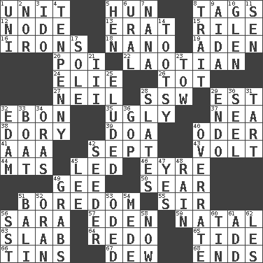 ACROSS 1. A single undivided whole 5. Attila the _ 8. Labels 12. Connecting point 13. Part of Q.E.F. 15. Cause heat under the collar 16. Removes the wrinkles 18. Billionth: prefix 19. Arabian gulf 20. Luau course 22. Of or relating to Laos or its people 24. Writer Wiesel 26. Small child 27. Famous astronaut Armstrong 28. Compass dir. 29. Eastern Standard Time (abbr.) 32. Inky black, to poets 35. Unsightly 37. Teachers' org. 38. Small, narrow, flatbottom fishing boat 39. ___ good deed 40. Baltic tributary 41. Auto club (abbr.) 42. Back-to-school mo. 43. Electrical Unit 44. Mountains (abbr.) 45. Directed 46. Jane of fiction 49. Unit of force equal to gravity 50. Scorch 51. Mood resulting from idleness 55. Title for a knight 56. "Two Mules for Sister ____" 57. Locale of original sin 59. Brizilian seaport 63. Thick slice 64. Make new 65. Periodic rise and fall of the sea level 66. Metal containers 67. Morning condensation 68. Extremities DOWN 1. Single; one (prefix) 2. Not either 3. Wedding promise 4. 3-inch nail 5. Layer 6. Mountain range 7. Nanny 8. Distinguishing feature 9. Opera by Verdi 10. Small, secluded valley 11. Elected rep. 14. A girl or young woman (variant) 17. Flatfish 21. One more than two 23. Pull behind 25. Dodged 28. Chalkboards 29. Inside; within (prefix) 30. Stitch closed the eyes of (a falcon) 31. Small pie 32. Dutch treat 33. Water vessel 34. Mouths or openings 36. Grand Old Party 40. Make much ado about nothing 42. Sowing specialist 45. Area sheltered from the wind 47. Affirmative reply 48. Precipitation 49. Takes hold of 51. Indonesian resort city 52. NW Algerian seaport 53. Wrote a lyric poem 54. Ancient Persian 56. Fast jet (abbr.) 58. At this time 60. Metal container 61. Find the sum of 62. French article