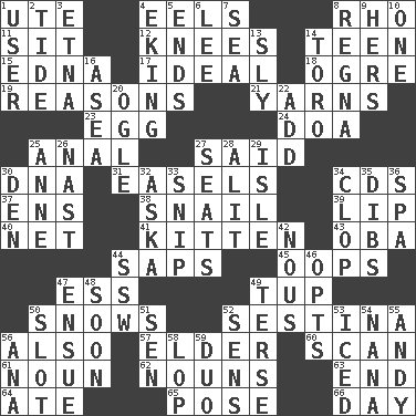 ACROSS 1. Shoshoni 4. Snakelike fish 8. 17th letter of the Greek alphabet 11. Be seated 12. Leg joints 14. Adolescent 15. Pulitzer Prize-winning author Ferber 17. Standard of perfection 18. Legendary monster 19. Thinks logically 21. Entertaining tales 23. Oval reproductive body of a fowl 24. ___ good deed 25. Of or related to the anus 27. Alleged 30. Heredity factor (abbr.) 31. Artist's stands 34. Music discs 37. Followers of ems 38. Slow-paced one 39. Mouth edge 40. Fish or hair follower 41. Baby cat 43. Chief or king in Benin or Nigeria 44. Plant excrements 45. I made a mistake 47. Curvy letter 49. Uncastrated adult male sheep 50. Frozen precipitation (plural) 52. French poetic form 56. In addition 57. A person who is older than you are 60. Glance over 61. Part of speech 62. Parts of speech 63. Conclude 64. Had dinner 65. Airs 66. 24 hours DOWN 1. One who makes use of a thing 2. Event that recurs at intervals 3. Inactive volcano in Sicily 4. Supplementing with great effort 5. Extremities 6. Area sheltered from the wind 7. Ocean 8. Canadian anthropologist Darnell 9. Possessive pronoun 10. Single 13. Cunning 14. "Corrida" creature 16. Toward the sea 20. Stare 22. Say or write further 25. Queen of England 1702-14 26. Political cartoonist Thomas 27. Theater features 28. Set down 29. Capri or Wright 30. Lair 32. "____ silly question..." 33. Sever or remove by pinching or nipping 34. Hoof sound 35. Rights 36. Health resort 42. Common sense 44. Compass dir. 46. Chooses 47. Follow as a consequence or result 48. Within a short period 49. Laconic 50. Narrow opening 51. Elected rep. 52. Elected reps. 53. On the rocks 54. Nanny 55. Actor Griffith 56. Santa ___, CA 58. Trim (branches) 59. Superhero pair