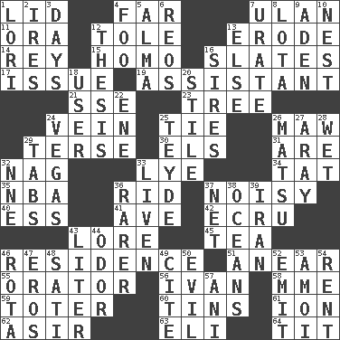 ACROSS 1. Flaplike covering 4. Distant 7. ____ Bator 11. Mouth or opening 12. Lacquered or enameled metalware 13. Eat (away) 14. Marina Del _, California 15. Like (prefix) 16. Chalkboards 17. Come out of 19. Helper 21. Compass dir. 23. Family _ (genealogy) 24. Distinctive style or manner 25. Standoff 26. Opening into something insatiable 29. Laconic 30. Raised railways 31. "We ___ not amused" (Victoria) 32. Tired old horse 33. Sodium hydroxide 34. Make lace 35. Basketball assoc. 36. To free from 37. Annoyingly loud 40. Double-curved letter 41. "___ Maria" 42. Shade of tan 43. Old wives' tales, e.g. 45. Afternoon social gathering 46. Home 51. Approach 55. Speaker 56. "Terrible" tsar 58. Madame (abbr.) 59. Carrier 60. Airtight sealed metal containers 61. Electrically charged atom 62. SW Saudi Arabia district 63. Biblical high priest 64. Teat (slang) DOWN 1. Australian parrot (variant) 2. Angers 3. 24-hour periods 4. Egg _ yung 5. _ mater 6. Vintage cars 7. A salt of uric acid 8. Globular water bottle used in Asia 9. Arabian gulf 10. Egg locale 12. College paper 13. Otherwise 16. Fathers 18. One who makes use of a thing 20. Vertical member of a panel or frame 22. Compass dir. 24. Viva Las _ 25. Miss Universe 1986, Barbara Palacios _ 26. Taiwanese island in East China Sea 27. Like ___ of sunshine 28. Dripping 29. Bar bills 32. Compass dir. 33. Make or become more lively 36. More valued for its uncommonness 37. Fish or hair follower 38. Seas 39. SW Asia republic 43. 61 cubic inches 44. Aroma 46. Round or rotation of duties 47. Greek god of love 48. Suttee (variant) 49. Quote 50. Tending to cause great harm 52. Give off 53. Mine, in Marseilles 54. Monthly bill 57. Cuckoo