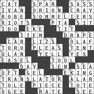 ACROSS 1. Feline 4. Practice fight 8. Backtalk 12. _ the terrible 14. Greek mythologigal hunter 16. Supercomputer manufacturer 17. Loose flowing garment 18. Wine waiters 20. Disturbances 22. Parent Teacher Association (abbr.) 23. Be seated 24. Wedding promise 25. Supplement with great effort 28. Teat (slang) 30. Detail 31. Window treatment 35. Automobile 37. Belonging to Elizabeth 40. Norwegian king 41. "Corrida" creature 42. Entreaties 44. Portable shelter 45. ____ Bator, Mongolia 46. Shout 47. Consenting reply 48. Artist's stand 50. Utensil 52. 24 hours 54. Elected rep. 55. Ocean 58. Often (poetically) 61. Set 63. Supplementing with great effort 65. Interpreter 70. Having or resembling wings 71. Lacquered or enameled metalware 72. Part 73. Lug 74. Double curve, resembling the letter S 75. Assign a rank or rating to 76. Perceive with the eye DOWN 1. High-altitude cloud 2. Stay clear from 3. Off limits 4. Distress signal 5. Adept person 6. Direct toward a target or goal 7. Frolic 8. _-fi 9. Ancient Greek god of war 10. Indian skirt 11. System (abbr.) 13. Fish or hair follower 15. Remaining after all deductions 19. Put down 21. Put into a specified state 26. Seaweed 27. Poet Dickinson 29. TNT 30. Pressed 32. Toward shelter 33. Baking dishes 34. Lizard (obsolete) 35. Root beer relative 36. Ancient river in northeast Turkey 38. Last letter of the English alphabet 39. Table seasonings 41. Third day of the wk. 43. _ gin 49. Falls behind 51. Single 53. Sharp bark 55. Grain storage towers 56. Related on the mother's side 57. Match 58. "Beetle Bailey" pooch 59. Tree-dwelling hopper 60. Falsehood 62. Den 64. Krazy ___ of comics 66. Born 67. Afternoon social gathering 68. Sep. follower 69. Portuguese money of account (variant)