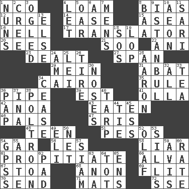 ACROSS 1. Non-commissioned officer (abbr.) 4. Rich soil 8. Prejudice 12. Goad 14. Relaxation 15. At sea 16. 1994 drama film starring Jodie Foster 17. Interpreter 20. Perceives with the eye 21. "Barney Miller" actor Jack 22. Cuckoo 23. Started a card game 27. Connect, as a bridge 29. Count _ (2 wds.) 31. Blind as ____ 34. Capital of Egypt 35. General guideline 36. Corncob 39. Eastern Standard Time (abbr.) 41. Spanish pot 42. Small Philippine buffalo 43. Consumed 46. Friends 47. Indian titles of respect 48. Adolescent 51. Mexican monetary units 54. Slender fish 56. French article 58. One who doesn't tell the truth 61. Appease 66. Inventor's middle name 67. Portico 68. Soon (poet.) 69. Sudden quick movement 70. Post 71. Floor coverings 72. Compass dir. DOWN 1. Religious women 2. Algonquian 3. Stared 4. Allow 5. Boat paddle 6. White ___ sheet 7. Not women's 8. Sound made by sheep 9. Byzantium, centuries later 10. Age 11. Indian skirt 13. Otherwise 18. Distress signal 19. Chop off 24. Nursemaid (var.) 25. Flowery wreath 26. Hoop that covers a wheel 28. Composer Copland 30. Olfactory organs 32. Everything 33. Afternoon social gathering 34. Desist 36. Infant food 37. _ tizzy (2 wds.) 38. Coward 40. Canvas cover 44. Neckwear 45. Curvy letter 49. Biblical high priest 50. Fish or hair follower 52. Norwegian king 53. Beverly of Met fame 54. Global Positioning Systems (abbr.) 55. Johnson of "Laugh-In" 57. Thailand, formerly 59. Deliberation 60. Assign a rank or rating to 62. Writing tablet 63. Santa ___, CA 64. Small child 65. Followers of ems