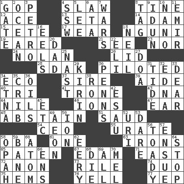 ACROSS 1. Grand Old Party 4. Cole _ (cabbage dish) 8. Prong on a fork 12. Adept person 13. Bristle 14. First of billions? 15. False hair 17. Erode 18. Group of southern Bantu languages 19. Having ears or earlike features 21. Perceive with the eye 23. Not either 24. Pitcher Ryan 26. Hat (slang) 28. Neighbor of Neb. 30. Manned the helm 34. Environmental prefix 37. Father 39. Helper 40. Three (prefix) 41. Marketplace scale 43. Heredity factor (abbr.) 44. "Death on the ____" 46. Charged atoms 47. Hearing organ 48. Choose not to consume 51. Saudi Arabian king (1953-1964) 54. Corporate head (abbr.) 55. A salt of uric acid 58. Chief or king in Benin or Nigeria 61. Single 63. Metal shackles 65. Eucharist need 67. Dutch treat 71. 90 degrees 72. At once, immediately (arch.) 73. Cause heat under the collar 74. Superhero pair 75. Equivocates 76. Shout 77. Slangy assent DOWN 1. Yard entry 2. Sea 3. Stone: prefix 4. Compass dir. 5. Area sheltered from the wind 6. "One Day ___ Time" 7. Armed conflicts 8. Label 9. Goddess of spring and wife of Bragi 10. Billionth: prefix 11. Arab leader 16. Snakelike fish 18. Famous astronaut Armstrong 20. June honoree 22. Connecticut Ivy Leaguer 25. Political cartoonist Thomas 27. ___ good deed 29. Japanese brewing company 30. Actor Sean's family 31. Event that recurs at intervals 32. Pulitzer Prize-winning author Ferber 33. Letter starter 34. Inactive volcano in Sicily 35. Baby bed with high sides 36. Lubricates 38. Friend of Pooh 42. He sold his birthright 45. And so on (abbr.) 49. Age 50. Electrically charged atom 52. RI univ. 53. Have the gumption 56. Sycophant 57. Take place subsequently 58. Brightly colored fish 59. Object of repulsion 60. Tiny particle 62. Suggestive of the supernatural 64. Constrict 66. Followers of ems 68. Pass on 69. Everything 70. Cartoonist voice _ Blanc