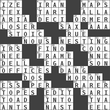 ACROSS 1. Ending with capital 4. SW Asia republic 8. Atlas contents 12. John Ritter's dad 13. Small pie 14. Silent film actress Nazimova 15. Roberta Peters solo 17. Tenth: prefix 18. Abalone 19. Failure 21. Saxophone 23. American Automobile Association (abbr.) 24. Unemotional 26. Sorrow 28. Good sense 30. Nestling 34. Big collection agency 37. Fine (Spanish) 39. Calm and collected 40. Born 41. Movie unit 43. Compass dir. 44. Small valley 46. Mild oath 47. Boy, to dad 48. Positions of authority 51. Mild oath, euphamism for damn 54. Two (Sp.) 55. Person of subnormal intelligence 58. Curvy letter 61. For each 63. More valued for its uncommonness 65. Drinks excessively 67. Prepare for publication 71. Indian skirt 72. Frog relative 73. To the inside or interior of 74. Federal power corp. 75. Pismires 76. Political cartoonist Thomas 77. Snakelike fish DOWN 1. Slanted text style (abbr.) 2. Nothings 3. Have an existence 4. It would 5. Actress Charlotte 6. Curve 7. Nuclear Threat Initiatives 8. Spoil 9. _ mater 10. Entreaty 11. "Two Mules for Sister ____" 16. Period of immesurable duration 18. The longest river in Central Asia 20. _ de Janeiro 22. "We ___ not amused" (Victoria) 25. Sleeve end 27. And so on (abbr.) 29. Founders of families 30. Roamer 31. Charged particles 32. Words to Nanette 33. Small, secluded valley 34. _ china 35. Coral collection 36. Automatically 38. Tired old horse 42. Dutch treat 45. Hat (slang) 49. 911 reaches them 50. Compass dir. 52. And not 53. Pate de foie ____ 56. Declaim 57. Boldness 58. Singer James 59. Within a short period 60. Petty quarrel 62. It's straight from the horse's mouth 64. Monetary unit of Yemen 66. Begley and Asner 68. Heredity factor (abbr.) 69. ___ a Wonderful Life 70. Small child