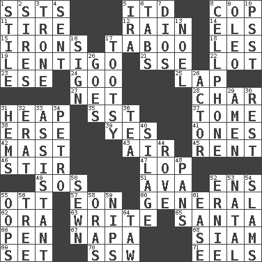 ACROSS 1. Fast planes 5. It would 8. Police officer (slang) 11. Hoop that covers a wheel 12. Water falling in drops from the sky 14. Raised railways 15. Removes the wrinkles 17. Off limits 18. French article 19. Small, flat, pigmented spot on the skin 21. Compass dir. 22. Car dealer's back yard 23. Compass dir. 24. Thick or sticky substance 25. Pet locale 27. Fish or hair follower 28. Burn to charcoal 31. Pile 35. Fast jet (abbr.) 37. Heavy book 38. Celtic language 39. Affirmative reply 41. Washington bills 42. Vertical spar for supporting sails 43. Atmosphere 45. Monthly bill 46. Disorderly outburst 47. Chop off 49. Mayday 51. Actress Gardner 52. Followers of ems 55. Baseball player Mel 57. A really long time 60. Commissioned military rank 62. Mouth or opening 63. Compose 65. Before Barbara or Clara 66. Animal enclosure 67. California wine valley 68. Thailand, formerly 69. Put into a specified state 70. Compass dir. 71. Snakelike fish DOWN 1. Vertical member of a panel or frame 2. Titles for men of rank and authority 3. Heavy duty weighing machine 4. Posted 5. Lyricist Gershwin 6. Bar bills 7. "Vaya con ____" 8. Portable communications device 9. Margarine 10. Inconspicuous attention getter 13. Christmas carol 16. Attach a signature 17. Tootsie (variant) 20. Travels 26. Thespian 29. So be it 30. Take ten 31. Folds over and sews together 32. Part of Q.E.F. 33. Helper 34. Stone: prefix 36. Beverage made from leaves 40. Fodder prepared in a silo 44. Be footloose 48. Baking dishes 50. Stitched 52. Bert's buddy 53. Brizilian seaport 54. Hits or strikes with great force 55. I made a mistake 56. Woody plant 58. Mouths or openings 59. Pinches, bites 61. Comfort 64. The 23rd letter of the Hebrew alphabet