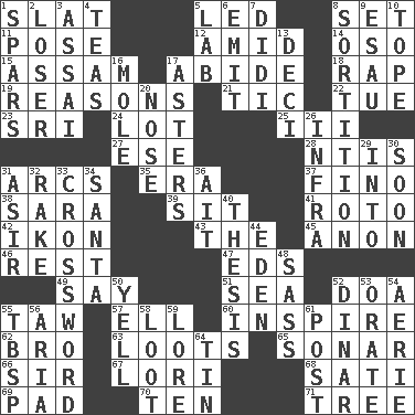 ACROSS 1. Narrow board 5. Directed 8. Put into a specified state 11. Airs 12. Among 14. Bear (Spanish) 15. Indian state 17. Remain 18. Strike 19. Thinks logically 21. Nervous spasm 22. Third day of the wk. 23. _ Lanka 24. Car dealer's back yard 25. One more than two 27. Compass dir. 28. Nuclear Threat Initiatives 31. Curves 35. Period 37. A pale, very dry sherry 38. "Two Mules for Sister ____" 39. Be seated 41. Printing process, for short 42. Visual representation of an object 43. Definite Article 45. Soon (poet.) 46. State of inaction 47. Begley and Asner 49. Declare 51. Ocean 52. ___ good deed 55. The 23rd letter of the Hebrew alphabet 57. Pipe bend 60. Motivate 62. Sis' sibling 63. Plunders 65. Echolocation 66. Title for a knight 67. Australian parrot (variant) 68. Suttee (variant) 69. Writing tablet 70. "___ Little Indians" 71. Relationship diagram DOWN 1. Practice fights 2. Failure 3. Slender Brazilian palm 4. Beverages made from leaves 5. Experiment locale 6. Send forth 7. "You Light Up My Life" star Conn 8. Determination 9. He sold his birthright 10. Drink excessively 13. Tenth: prefix 16. Undercover agent 17. Michaelmas daisies 20. Sense of smell 26. Kind of red light 29. To the inside or interior of 30. Within a short period 31. SW Saudi Arabia district 32. Immoral or dissolute person 33. What you're doing now 34. Before Barbara or Clara 36. Small island 40. College paper 44. Paradise 48. Backtalk 50. Shout 52. Middle Eastern gold or silver currency 53. Declaim 54. Nest on high 55. Cook's measure (abbr.) 56. Roberta Peters solo 58. Spoils 59. Old wives' tales, e.g. 61. Mail 64. Metal container