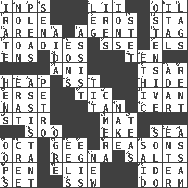 ACROSS 1. Naughty children 5. Cards in a Roman deck? 8. Lubricate 11. Hero or heavy, e.g. 12. Greek god of love 14. R.R. building 15. Sports stadium 17. Rep 18. Label 19. Sycophants 21. Compass dir. 22. Raised railways 23. Followers of ems 24. Two (Sp.) 25. "___ Little Indians" 27. Black tropical American cuckoo 28. Russian ruler of old 31. Pile 35. Fast jet (abbr.) 37. Flintstone garb 38. Celtic language 39. Nervous spasm 41. _ the terrible 42. Political cartoonist Thomas 43. Scottish cap 45. Sure thing 46. Tumult 47. Floor covering 49. "Barney Miller" actor Jack 51. Supplement with great effort 52. Ocean 55. Sep. follower 57. Turn to the right 60. Thinks logically 62. Mouth or opening 63. Canadian anthropologist Darnell 65. Table seasonings 66. Animal enclosure 67. Writer Wiesel 68. The content of cognition 69. Put into a specified state 70. Compass dir. 71. Dormintory (informal) DOWN 1. Feeling or showing extreme anger 2. Person of subnormal intelligence 3. Entreaties 4. Transmit 5. Part of a journey 6. Angers 7. Charged atoms 8. Clearly or manifestly demonstrative 9. Slanted text style (abbr.) 10. Fails to keep up a pace 13. Proofreading order 16. Opera by Verdi 17. Help 20. Immeasurably long periods of time 26. Value system 29. The sixth month of the Jewish calendar 30. Monthly bill 31. Coop moms 32. Part of Q.E.F. 33. Aide 34. Stone: prefix 36. Teat (slang) 40. Device for capturing images 44. Cause to be 48. Beverages made from leaves 50. Legendary monster 52. Twentieth part of a lira 53. Keyboard key 54. Indian state 55. I made a mistake 56. Algonquian 58. Snakelike fish 59. The front part of a cuirass 61. Expressed in words 64. ___ Haven, CT
