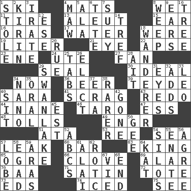 ACROSS 1. What Jean-Claude Killy likes to do 4. Floor protectors 8. Soggy 11. Become fatigued 13. Native American of Southwest Alaska 15. Ewer handle 16. Mouths or openings 17. Wetness 18. We are 19. 61 cubic inches 21. Sight organ 22. Domed church section 23. Compass dir. 24. Shoshoni 27. Avid follower 29. Lick closed 30. Perfect 34. At this time 36. Fermented drink made from hops 39. Miss Universe 1986, Barbara Palacios _ 40. "Two Mules for Sister ____" 41. Strangle with an iron collar 43. Make new 44. Silly 46. Pacific island yam 47. Double-curved letter 48. For Whom the Bell _____ 49. Engineer (abbr.) 51. "One Day ___ Time" 53. To riddle 54. Ocean 57. Path through which fluid escapes 60. Soap unit 63. Supplementing with great effort 65. Legendary monster 66. Garlic unit 69. Having or resembling wings 70. Sound made by sheep 71. Smooth fabric 72. Haul 73. Begley and Asner 74. On the rocks 75. Perceive with the eye DOWN 1. Fur scarf 2. Japanese brewing company 3. Feeling or showing extreme anger 4. Informal term for the mouth 5. In the manner of 6. False hair 7. Chop _ 8. Shed a tear 9. Hearing organs 10. Relationship diagram 12. Compass dir. 14. Unclean, religiously 18. Nomad 20. Regret 25. Bar bills 26. Opt 28. Small island 29. Tchaikovsky ballet 31. Sight organs 32. Does sums 33. Lion 34. Billionth: prefix 35. Relating to the mouth 37. Epoch 38. More uncommon 40. Be seated 42. Went 45. Eastern Standard Time (abbr.) 50. Unit of force equal to gravity 52. Lettered men learn these first 54. Grain storage towers 55. Related on the mother's side 56. Match 57. Ear part 58. Mild oath 59. Ancient river in northeast Turkey 61. Jai ____ 62. College mil. group 64. Krazy ___ of comics 67. Compete 68. Conclude