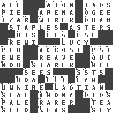 ACROSS 1. 100% 4. Smallest unit of an element 8. Small amounts or degrees 12. Sliced dessert 13. Sports stadium 14. Double curve, resembling the letter S 15. Russian ruler 17. One who wires 18. NW Algerian seaport 19. Paper fasteners 21. Michaelmas daisies 23. Part of HMS, perhaps 24. Part of a journey 26. Compass dir. 27. Painter Guido (1575-1642) 28. "I Love _" 30. For each 31. Buttonhole 34. Pacific Standard Time (abbr.) 37. Compass dir. 38. Break or tear apart 39. Fr. "Yes" 40. Allow head to fall sleepily 41. A viewer who gazes fixedly 42. To separate or throw off 43. Perceives with the eye 44. Fast planes 46. ___ good deed 47. Lizard (obsolete) 50. Ewer handle 51. Undo the wiring of 54. Of or relating to Laos or its people 57. Lick closed 58. Odor 60. "Vaya con ____" 62. Light colored 63. More valued for its uncommonness 64. Afternoon social gathering 65. Downhill vehicle 66. Oceans 67. Insidious DOWN 1. Fitting 2. Belonging to Elizabeth 3. Resembling or made to resemble leather 4. Satellite of Uranus 5. Laconic 6. Single 7. Hindu Mythology: god of death 8. Tootsie (variant) 9. Match 10. Letter starter 11. Elected reps. 13. Leather borer 16. Water falling in drops from the sky 20. 23rd letter of the Greek alphabet 22. Religious group 25. Michael Jackson trademark 27. Former U.S. Attorney General Janet 29. One who uses or employs something 30. Animal enclosure 31. Johnson of "Laugh-In" 32. Stop 33. Automobile 34. Likenesses of persons 35. Takes to court 36. Make a knot 41. Wither 43. Dirtied 44. Arrange properly for use 45. Alleged 46. A sleeping potion; an opiate (poet.) 48. Plants 49. Softens 51. United States Postal Service (abbr.) 52. Be tempered by heat 53. Hearing organs 55. Boat paddle 56. Christmas carol 59. Actress Charlotte 61. Declare
