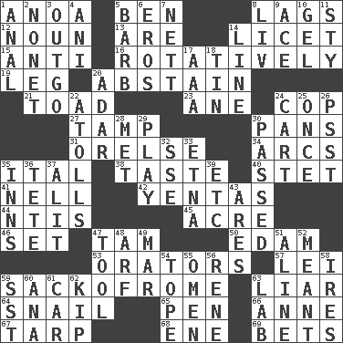 ACROSS 1. Small Philippine buffalo 5. Benjamin's nick name 8. Straggles 12. Part of speech 13. "We ___ not amused" (Victoria) 14. It is permitted: Lat. 15. Against 16. Rotating or pertaining to rotation 19. Part of a journey 20. Refrain by choice 21. Frog relative 23. One (Scot) 24. Police officer (slang) 27. Pack (down) 30. Zero-star reviews 31. Threatening words 34. Curves 35. Slanted text style (abbr.) 38. Clothes sense 40. Proofreading order 41. 1994 drama film starring Jodie Foster 42. Gossips 44. Nuclear Threat Initiatives 45. Measure of real estate 46. Arrange properly for use 47. Scottish cap 50. Dutch treat 53. Speakers 57. Luau accessory 59. Italian handbag shop? 63. One who doesn't tell the truth 64. Slow-paced one 65. Animal enclosure 66. Queen of England 1702-14 67. Canvas cover 68. Compass dir. 69. Stakes DOWN 1. Of or related to the anus 2. Music written for nine 3. Money paid out 4. Black tropical American cuckoo 5. Sharp remark 6. Greek god of love 7. Remaining after all deductions 8. 54 in ancient Rome 9. Adept person 10. Set 11. Filthy place 14. Actor's bit 17. Auto club (abbr.) 18. Shallow baking pan 20. The sixth month of the Jewish calendar 22. Ringlike coral islands and reefs 24. Haul 25. At one time in the past 26. Inconspicuous attention getter 28. Was introduced to 29. Romp 30. Went by 32. Compass dir. 33. Inactive volcano in Sicily 35. Restaurants 36. Wig 37. Came down and settled, as after flight 39. And so on (abbr.) 43. Ancient Greek god of war 47. Utensil 48. Sandy's bark 49. Spoil 51. Place in a line 52. Intended 54. Drink excessively 55. Sign of things to come 56. French philosopher Descartes 58. Angers 59. Fast jet (abbr.) 60. Santa ___, CA 61. 4-wheeled motor vehicle 62. Monetary unit of Laos 63. Experiment locale