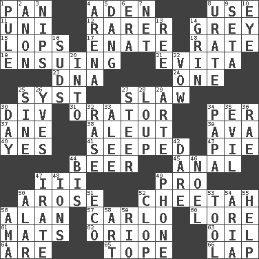 ACROSS 1. Baking dish 4. Arabian gulf 8. Purpose 11. University (slang) 12. Less widely known 14. Jennifer or Joel 15. Chops off 17. Maternal 18. Pace 19. Taking place subsequently 21. Webber/Rice musical 23. Heredity factor (abbr.) 24. Single 25. System (abbr.) 27. Cole _ (cabbage dish) 30. HTML Container Element 31. Speaker 34. For each 37. One (Scot) 38. Eskimo relative 39. Actress Gardner 40. It is so 41. Oozed 43. Sliced dessert 44. Fermented drink made from hops 45. Of or related to the anus 47. One more than two 49. Adept person 50. Came up 52. Leopard's kin 56. ____ Jay Lerner 57. Monte _, Las Vegas Hotel/Casino 60. Old wives' tales, e.g. 61. Floor coverings 62. Greek mythologigal hunter 63. Petroleum 64. "We ___ not amused" (Victoria) 65. Drink excessively 66. Infant locale DOWN 1. Whine 2. At once, immediately (arch.) 3. Pinches, bites 4. Sports stadium 5. Mild oath, euphamism for damn 6. Period 7. Fish or hair follower 8. A salt of uric acid 9. Stalk of a moss capsule 10. Sight organ 13. To sift 14. Broad smile 16. Beer foam 20. To the inside or interior of 22. Solemn pledge 25. Trig term 26. Jacques Cousteau's middle name 27. Bull 28. Central Nebraska county 29. Johnson of "Laugh-In" 30. 24 hours 32. Raze (variant) 33. Toward shelter 34. Dad 35. Tending to cause great harm 36. Actress Charlotte 42. Have the gumption 44. Altar cloth linen 46. Christmas carol 47. Feeling or showing extreme anger 48. Charged particles 49. Give a jingle 50. Having or resembling wings 51. Environmental prefix 52. Hoof sound 53. Utensil 54. Roberta Peters solo 55. Assist 56. Nanny (var.) 58. Nonscientific branch of learning 59. _ de Janeiro