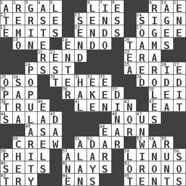 ACROSS 1. Therefore, facetiously 6. Untruth 9. Actress Charlotte 12. Laconic 13. Elected reps. 14. Omen 15. Sends forth 16. Extremities 17. Double curve, resembling the letter S 18. Single 19. Inside; within (prefix) 20. Scottish caps 21. Tear apart 23. Period 24. Inconspicuous attention getter 25. Nest on high 28. Bear (Spanish) 30. Giggle 34. Texas town _ City 35. Infant food 36. Moved through 38. Flowery wreath 39. Loyal 41. Soviet premier 1918-24 43. Ingest 44. Vegetable dish 46. Horse sense 48. White ___ sheet 49. Merit 50. Ship's personnel 51. The sixth month of the Jewish calendar 53. Armed conflict 56. Silvers or Donahue 57. Having or resembling wings 58. "_ and Lucy" (Charlie Brown theme song) 60. Puts into a specified state 61. Negative votes 62. U. of Maine site 63. Attempt to accomplish something 64. Followers of ems 65. Portable shelters DOWN 1. Had dinner 2. San ____ (Riviera town) 3. Amused look 4. Michaelmas daisies 5. French article 6. Grant temporary use of 7. Southeast Asian peninsula 8. Curvy letter 9. Frustrating wastes of time 10. Ripens 11. Compass dir. 13. Transmit 14. Flew 19. Keyboard key 20. Afternoon social gathering 22. Eastern Standard Time (abbr.) 24. Teen's desire 26. It may be bright or harebrained 27. Prepare for publication 28. Elects 29. "Two Mules for Sister ____" 31. Actor Linden 32. Make supply last 33. Car or cant ending 37. Middle Eastern gold or silver currency 40. Artist's stands 42. Not either 45. Obsolete 47. Undo the wiring of 49. Hearing organs 50. "Mermaids" star 51. ____ Jay Lerner 52. 24-hour periods 54. Soon (poet.) 55. Undersized animal 56. Pacific Standard Time (abbr.) 57. A saturated hydrocarbon 58. Car dealer's back yard 59. Mayday