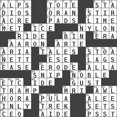 ACROSS 1. High mountains 5. Carryall 9. R.R. building 12. "Vaya con ____" 13. Northwest Algerian city 14. Use a spoon 15. Measure of real estate 16. Groovy apts. 17. Welles in "The Third Man" 18. Was introduced to 19. Frozen water 21. Thermoplastic polyamide 22. Travel on an animal 24. Storage container 26. Period 27. Composer Copland 28. Johnson of "Laugh-In" 29. Roberta Peters solo 30. Lies 32. Portico 36. Remaining after all deductions 37. Compass dir. 38. Falls behind 39. Comfort 40. Eat (away) 42. Silent film actress Nazimova 43. Clip 44. Having high moral qualities 46. And so on (abbr.) 49. Binary compound 50. Abrupt rush of wind 51. _____ steamer (cargo ship) 53. Medical imaging device (abbr.) 54. Leather borer 57. Israeli folk dance 58. Monetary unit of Botswana 61. Toward shelter 62. In an inward manner 63. Long journey 64. Arranges properly for use 65. Corporate head (abbr.) 66. Assistant 67. Inconspicuous attention getter DOWN 1. First man 2. Louse (plural) 3. Likenesses of persons 4. Compass dir. 5. Drink excessively 6. Mouth or opening 7. Small boy 8. Followers of ems 9. Vertical member of a panel or frame 10. Southeast Indonesia island 11. Sports stadium 14. Roguish 19. Wedding promise 20. Penny 21. Compass dir. 23. Feeling or showing extreme anger 24. A special lineage 25. ___ a Wonderful Life 27. Type of rug 28. Columnist Joseph or Stewart 29. One (Scot) 31. Nest on high 32. Broad, flat, thick pieces 33. Baron Munchausen's specialties 34. Stare 35. White ___ sheet 40. Conclusion 41. Engineer (abbr.) 43. Small drink 45. Fr. "Yes" 46. Value system 47. Marketplace scale 48. Monte _, Las Vegas Hotel/Casino 52. Can I? 53. Cause to be 55. Moistens 56. For fear that 58. Parent Teacher Association (abbr.) 59. RI univ. 60. Directed 61. Cleo's killer