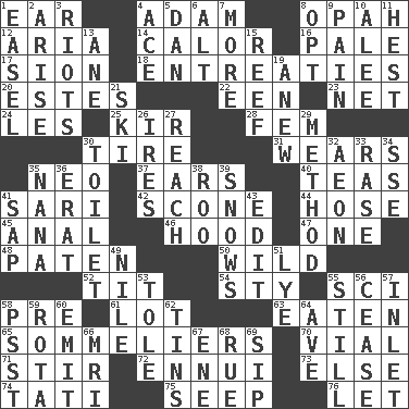 ACROSS 1. Ewer handle 4. First man 8. Brightly colored fish 12. Operatic vocal solo 14. Bodily heat indicating an inflammation 16. Light colored 17. The Jewish people; Israel 18. Pleas 20. _____ Park, CO 22. Car or cant ending 23. Fish or hair follower 24. French article 25. Apertif with cassis 28. Opposite of masc. 30. Become fatigued 31. Puts on (as clothing) 35. Modern: prefix 37. Hearing organs 40. Afternoon social gatherings 41. Indian skirt 42. Biscuitlike quick bread 44. Stockings 45. Of or related to the anus 46. Parka part 47. Single 48. Eucharist need 50. Uncontrolled 52. Teat (slang) 54. Filthy place 55. _-fi 58. Before (prefix) 61. Car dealer's back yard 63. Eroded 65. Wine waiters 70. Small bottle 71. Move through with a circular motion 72. World-weariness 73. Otherwise 74. Jacques of French films 75. Ooze 76. Allow DOWN 1. Artist's stand 2. Get up 3. Disturbances 4. Adept person 5. Daniel's nick name 6. Keyboard modifier key 7. Greater amount 8. Choose 9. Ache 10. Toward shelter 11. Behest 13. A saturated hydrocarbon 15. Coral collection 19. Afresh 21. What Jean-Claude Killy likes to do 26. Angers 27. Arrive at 29. Mode 30. Rest room 32. Period of immesurable duration 33. Raze (variant) 34. Compass dir. 35. Nanny 36. Part of Q.E.F. 38. Friend of Pooh 39. Overwhelms 41. Plant excrement 43. Prepare for publication 49. Mediterranean tributary 51. Sodium hydroxide 53. Lacquered or enameled metalware 55. Free of sound 56. Desist 57. An arm off of a larger body of water 58. Inconspicuous attention getter 59. Round or rotation of duties 60. Send forth 62. Canisters 64. "___ Maria" 66. Medical imaging device (abbr.) 67. Compass dir. 68. Regret 69. Small drink