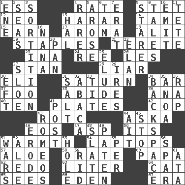 ACROSS 1. Curvy letter 4. Assign a rank or rating to 8. Proofreading order 12. Modern: prefix 13. Ethiopian city, capital of Harari 14. Docile 15. Merit 17. Odor 18. Set down 19. Paper fasteners 21. Cylindrical with tapered ends 23. _ tizzy (2 wds.) 24. To riddle 26. French article 27. Comedian Laurel of Laurel & Hardy 28. One who doesn't tell the truth 30. Biblical high priest 31. Titan orbits this 34. Soap unit 37. Egg _ yung 38. Remain 39. Santa ___, CA 40. "___ Little Indians" 41. Food holders 42. Police officer (slang) 43. College mil. group 44. "____ silly question..." 46. Greek goddess of the dawn 47. Viper 50. ___ a Wonderful Life 51. Heat 54. Portable computers 57. Medicinal plant 58. Declaim 60. Dad 62. Do over again 63. 61 cubic inches 64. Feline 65. Perceives with the eye 66. Paradise 67. Period DOWN 1. Compass dir. 2. Oceans 3. Drawing lots 4. More uncommon 5. Came up 6. Scottish cap 7. Part of Q.E.F. 8. A viewer who gazes fixedly 9. Lies 10. Give off 11. False hair 13. Actor Linden 16. Nanny 20. Baking dish 22. Style 25. Evade 27. A type of plum 29. Angers 30. Newt 31. Table seasoning 32. Phillipine bananalike plant 33. Teat (slang) 34. Keyboard key 35. Small Philippine buffalo 36. Strike 41. Mail 43. Lover boys 44. Small island 45. Obstruct or block passage 46. Wear away 48. Chalkboard 49. Eucharist need 51. Armed conflicts 52. Toward shelter 53. Hollow 55. For each 56. Coast Guard woman 59. To free from 61. "One Day ___ Time"